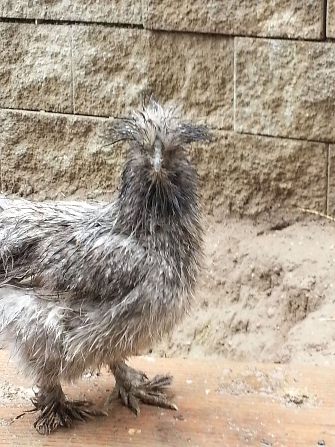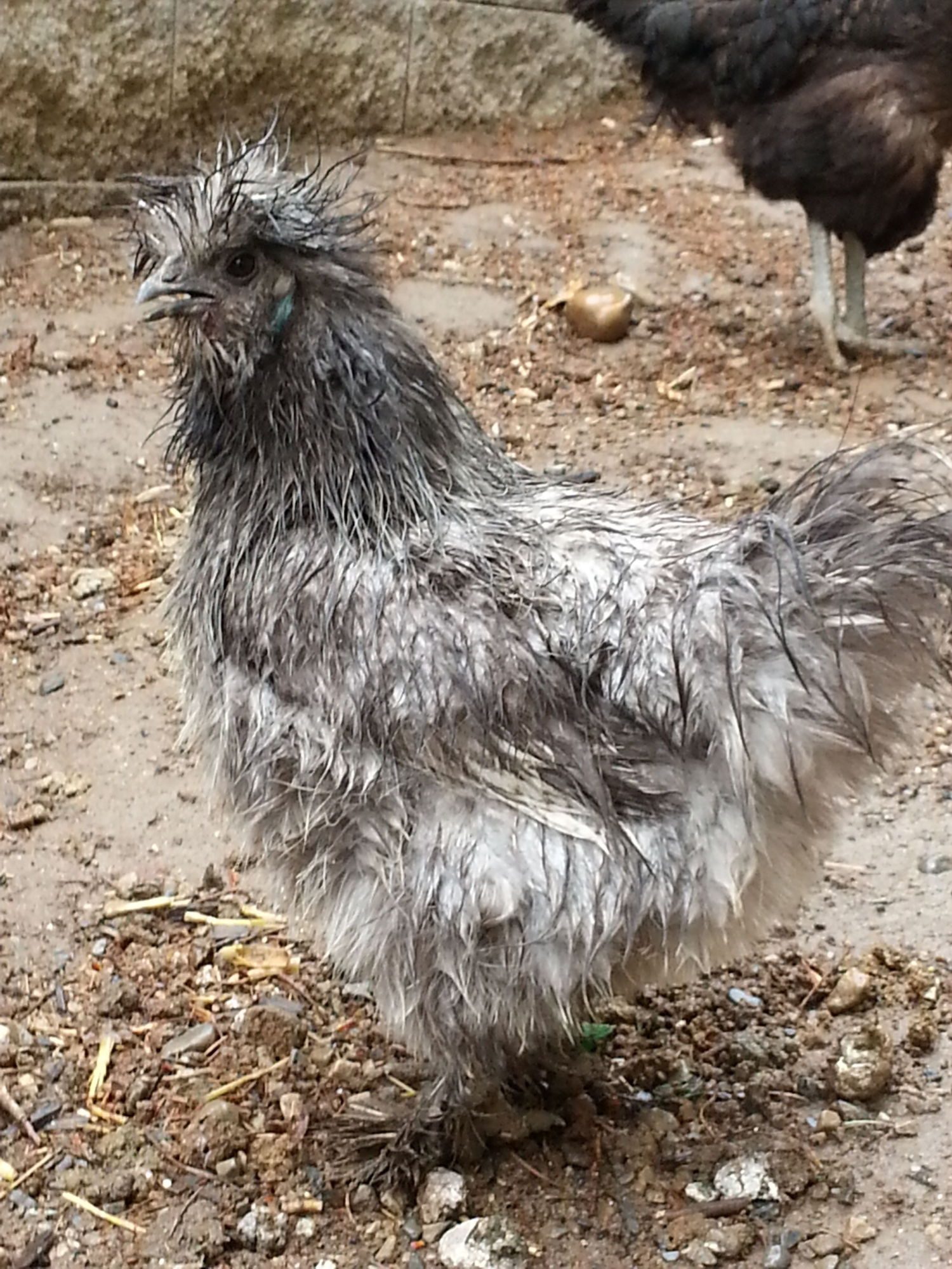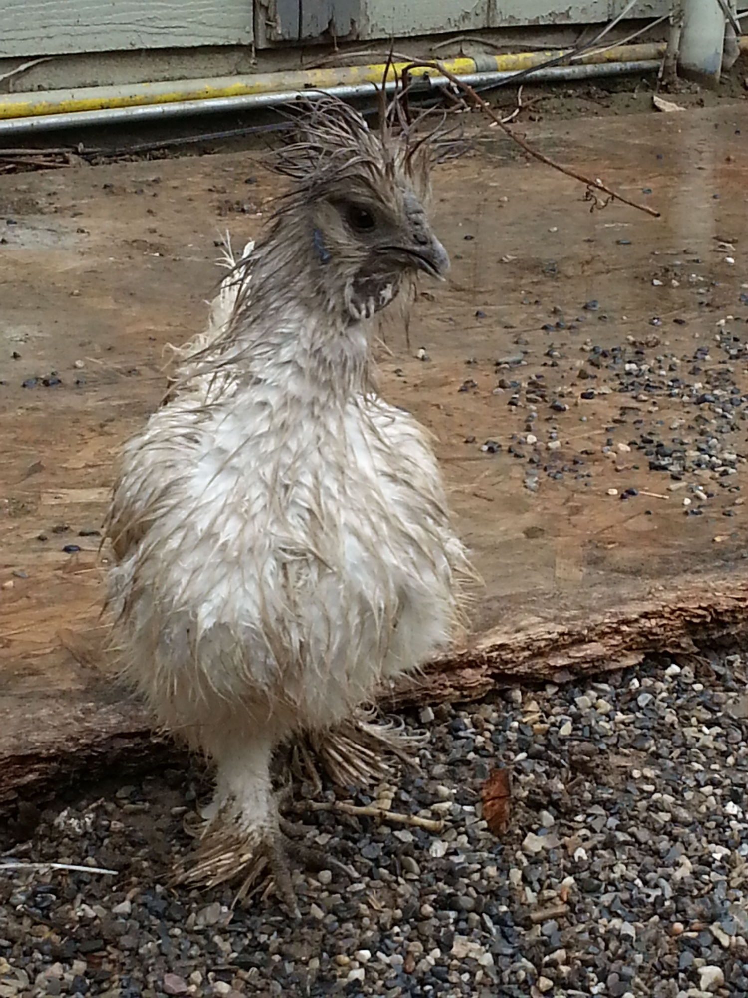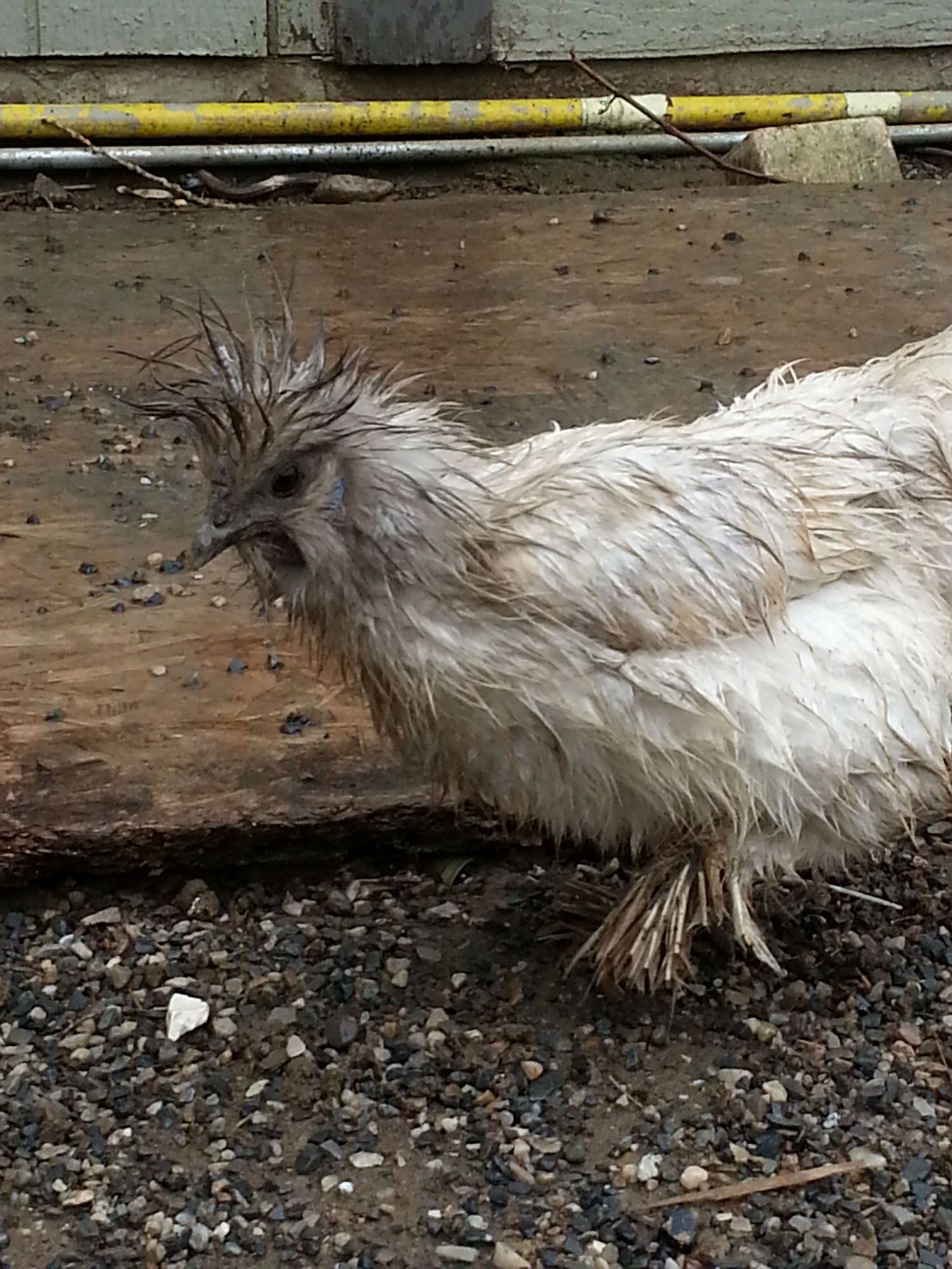 No my girls have never gone out in the snow or the rain, they all hang out in their mega huge coop, they have food and water in there, plus 9 ft by 12 ft of dirt floor, or they will go out, but they go under my huge pine tree pretty much no snow or even rain gets through that tree, so its usually fully dry or just damp under there, and they have at least a 20 foot round area there. So no I've never seen them wet. And they are really wet. I looked out the window, and at first I thought they got locked down there. Nope they are out in the mud. The rest was up in the coop, but when I came out they all came running looking for treats. I couldn't believe how different their color looks. I just had to laugh at them. The black/silver partridge I have is the funniest looking.