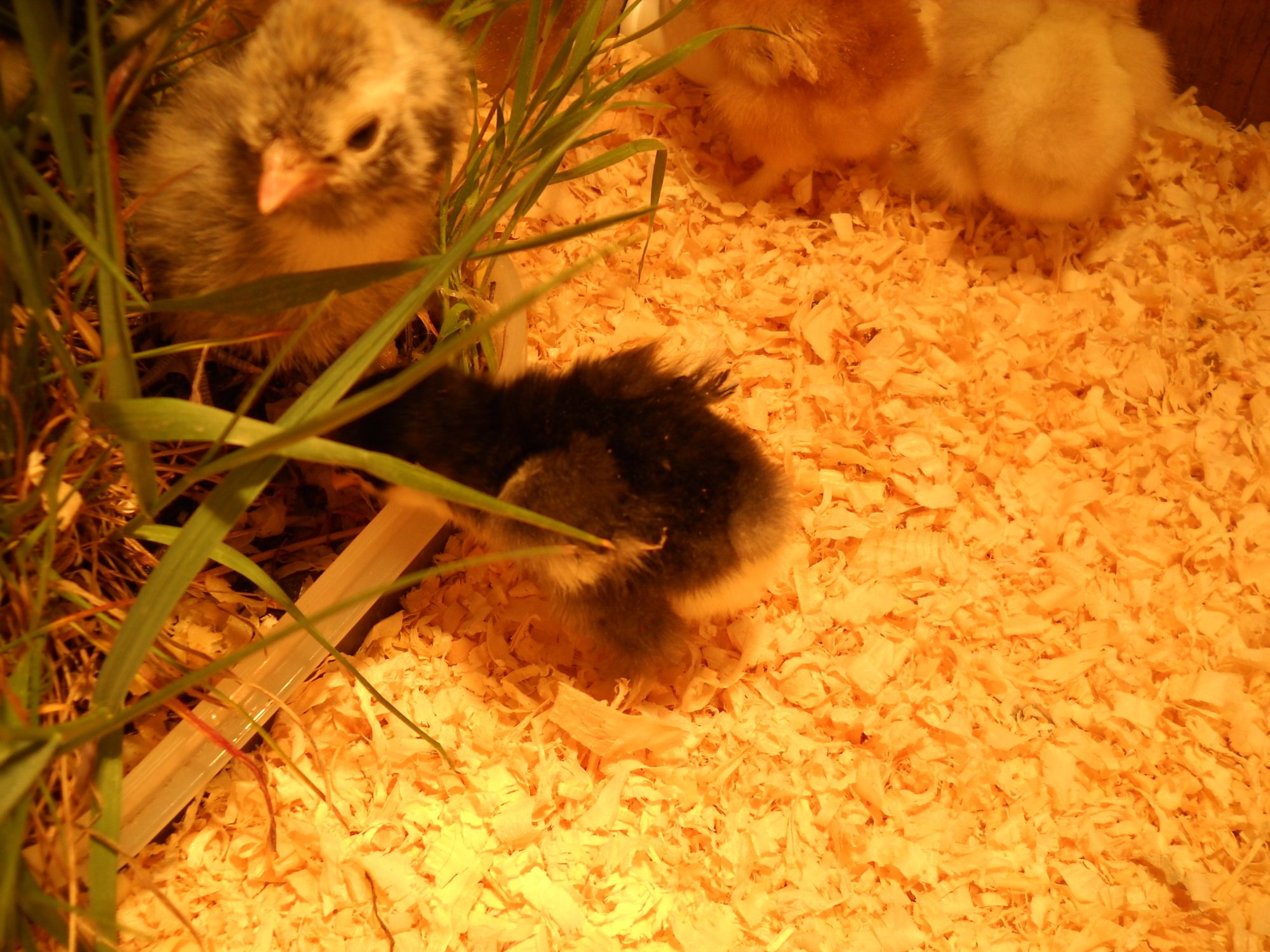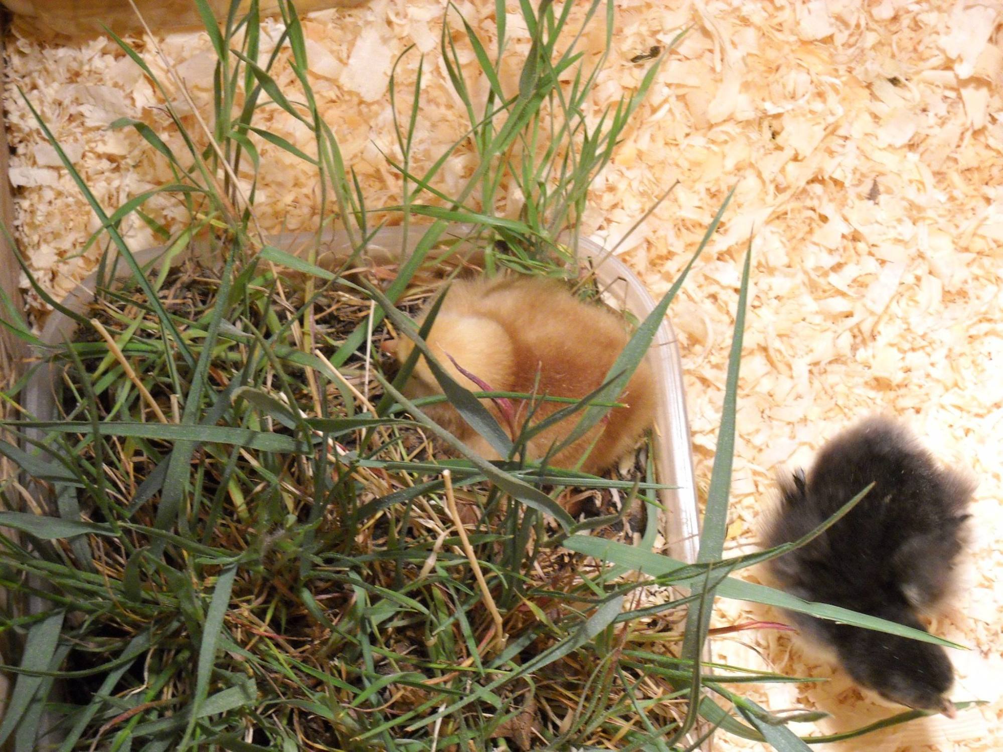 Your tight space might be what is causing the bullying. With my first set of 15 chicks I had them in too small of a brooder and it lead to bullying, cannibalism and feather picking/eating. It was impossible to cure them of this. Even after I moved them to their 12x15 ft coop and 1/2 acre run they continued to pick at each other so badly and nothing I could do (believe me I tried everything under the sun) would stop it. I'm sure your situation isn't as dyer but I would watch very carefully that the bullying doesn't draw blood because it goes downhill fast. I would just try the grass. Shovel up a clump that has some taller sprigs. The chicks will love running through it and it will give the picked on one a place to dodge the bully (it will even distract the bully). Here is an example of my little ones hiding in some grass:I will have to try something like that.... I put in another roost that was a bit higher than their current one... It's a bit tight on extra space in there, so I'll have to figure out something that won't take up much spacethanks!