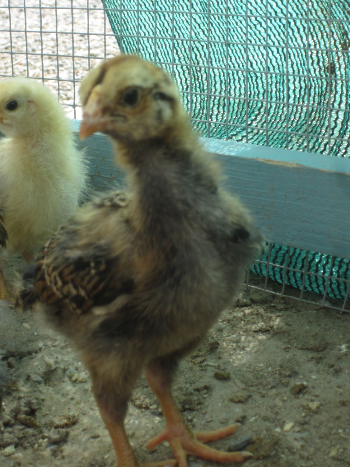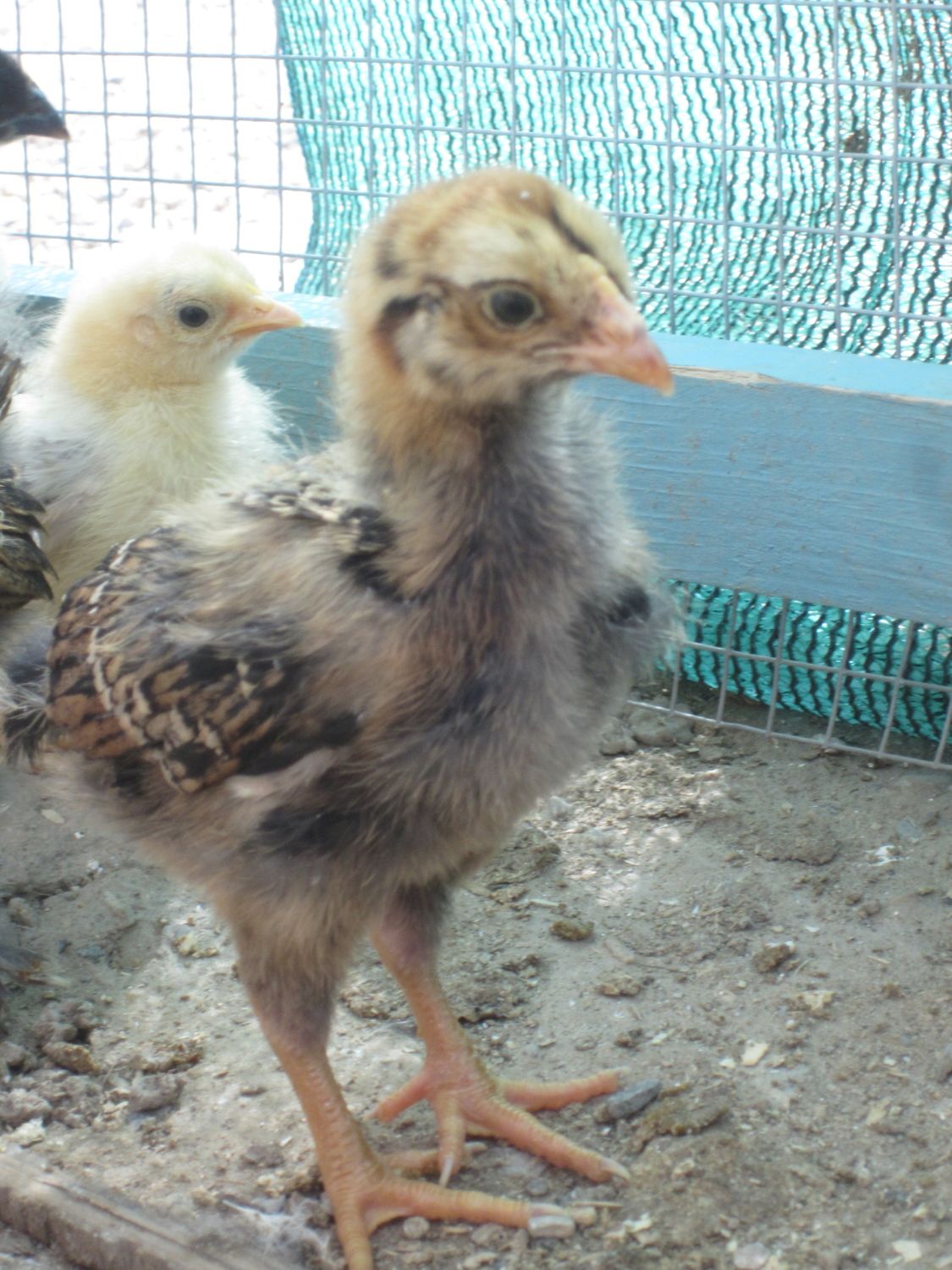 So I picked up my new chicks. And they are outside loving the sun, and rolling in the dirt. But here is the one that we don't know what it is. Pea comb, yellow legs, bright barring. Any thoughts? RedIII thought it was a SB, but it doesn't have a double comb.