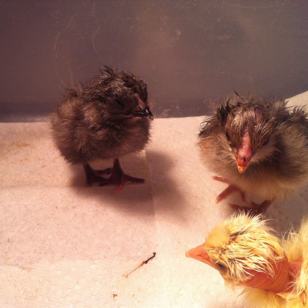 I grabbed a few quick shots before leaving...these are the ones out I have gotten out of the bator, they are just brand new! See the turken with the black spot? So cute. Crossies.