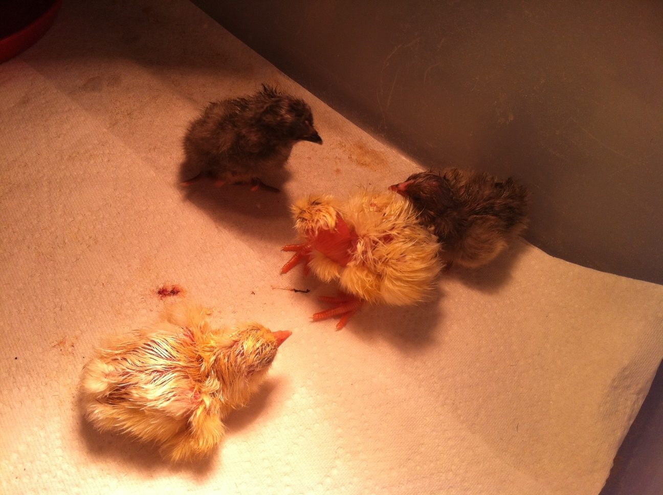 I grabbed a few quick shots before leaving...these are the ones out I have gotten out of the bator, they are just brand new! See the turken with the black spot? So cute. Crossies. :D