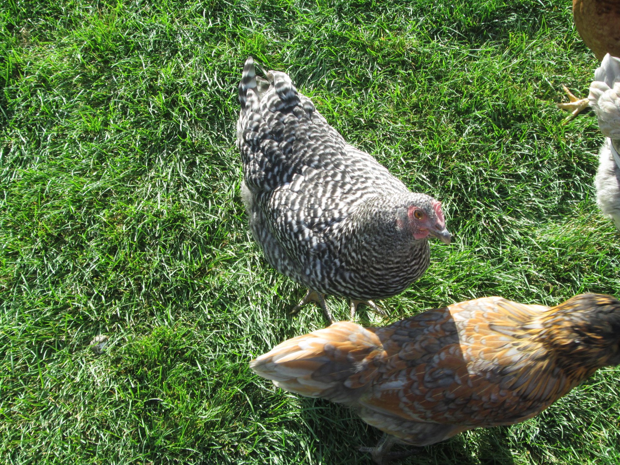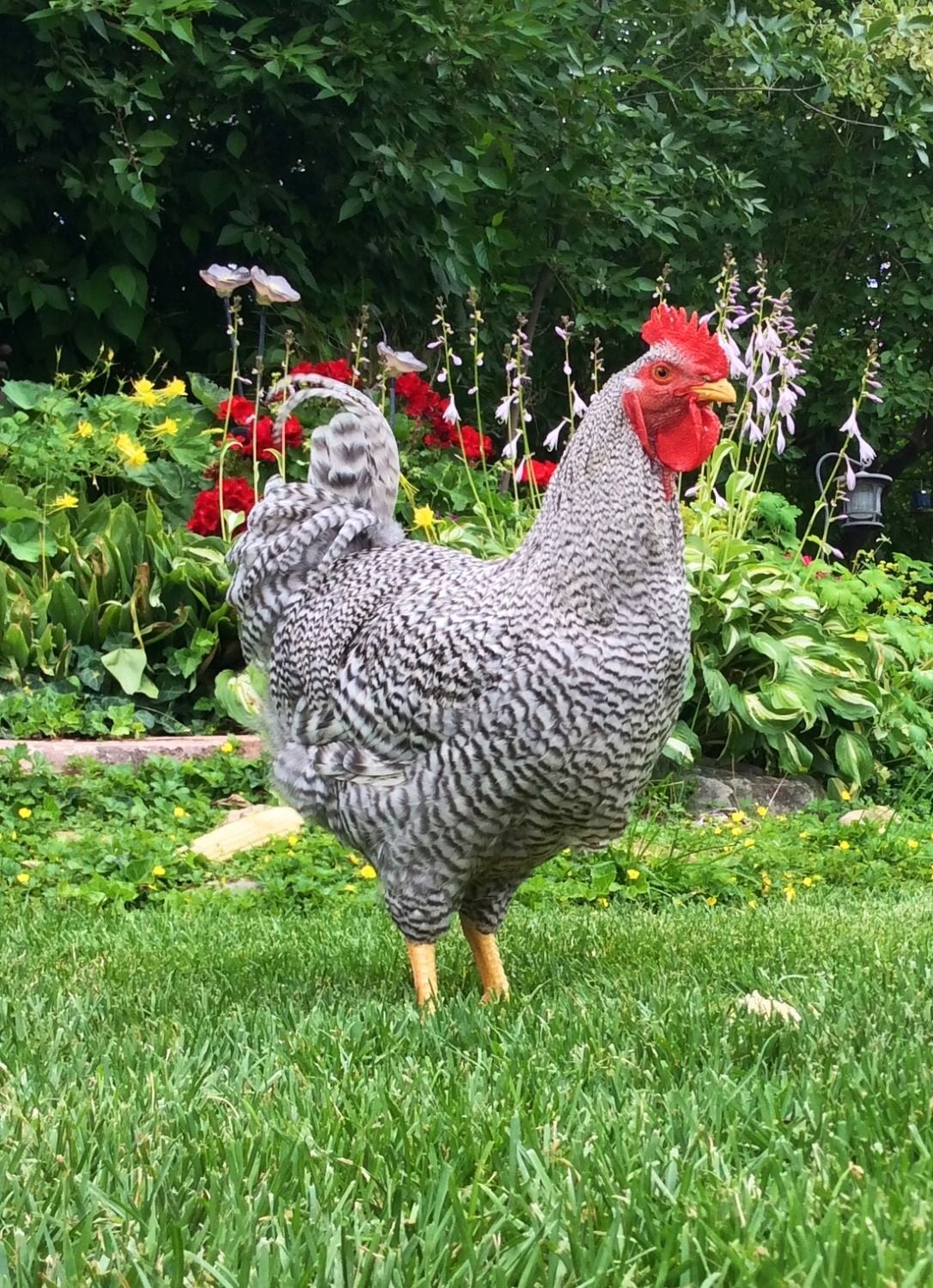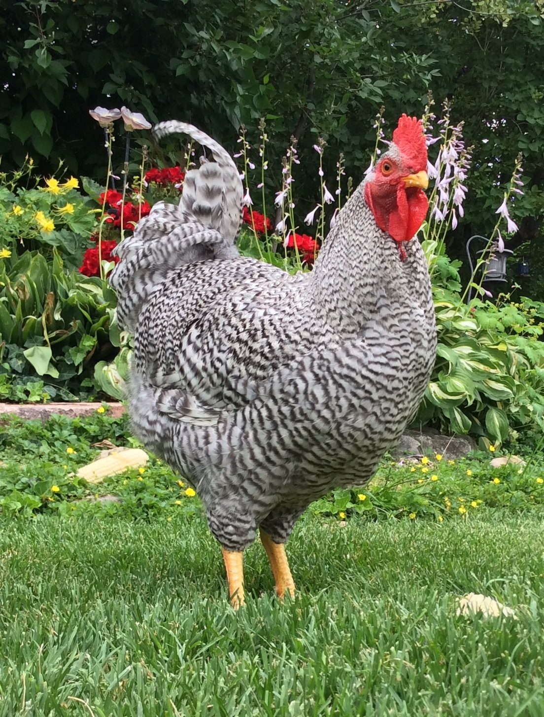 In the continuing sage of Rooster Cogburn, I've a few new photos for pfrosty and family. And an interesting event which transpired this evening. We were giving some fresh uncooked corn to the birds this evening. RC presided over the event in his usual majestic style. When all of a sudden, a stupid dog came through the yard, we are just sitting out there on the lawn, enjoying watching the birds, and before we could even say a word… RC went over and stood that mutt down. Amazing, He is doing his job, in first class style. We just love him. I am a very proud keeper of what has turned out to be a wonderful adoption into our flock of a first class Barred Rock roo.