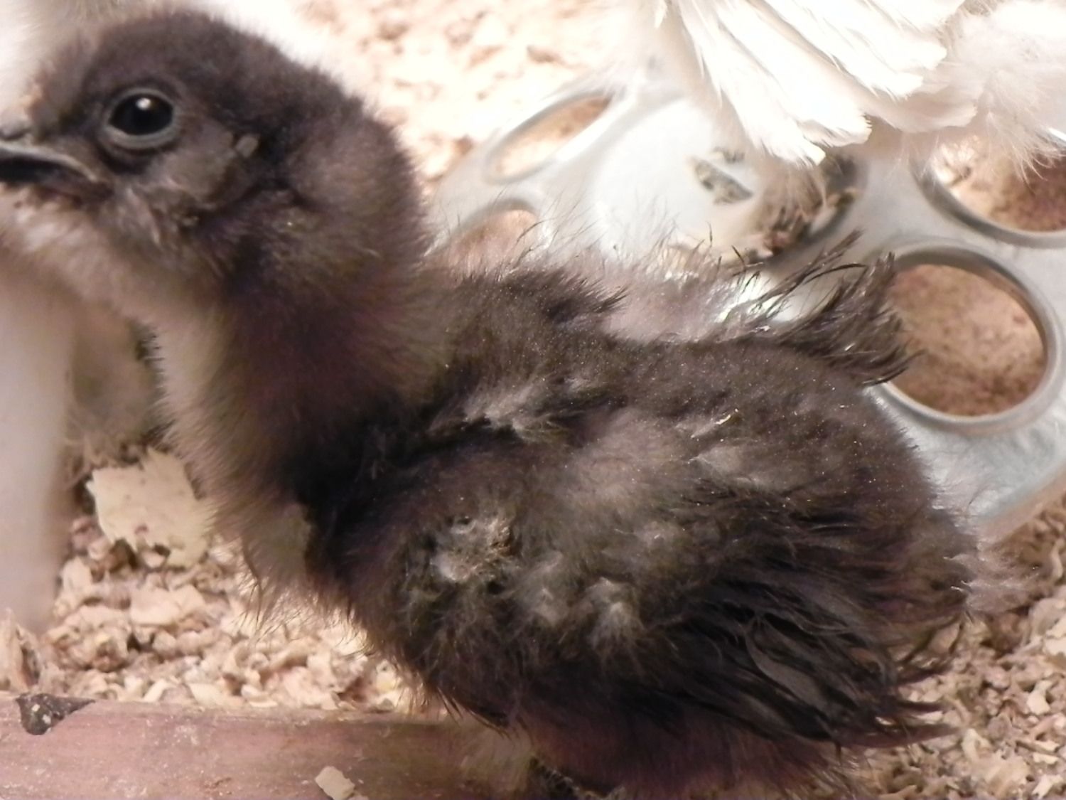 The wing feathers look like they are not barbed. Here is the little black one that had the giant beard. Its wing feathers are barb-less like a Silkie but they are supper frizzled.