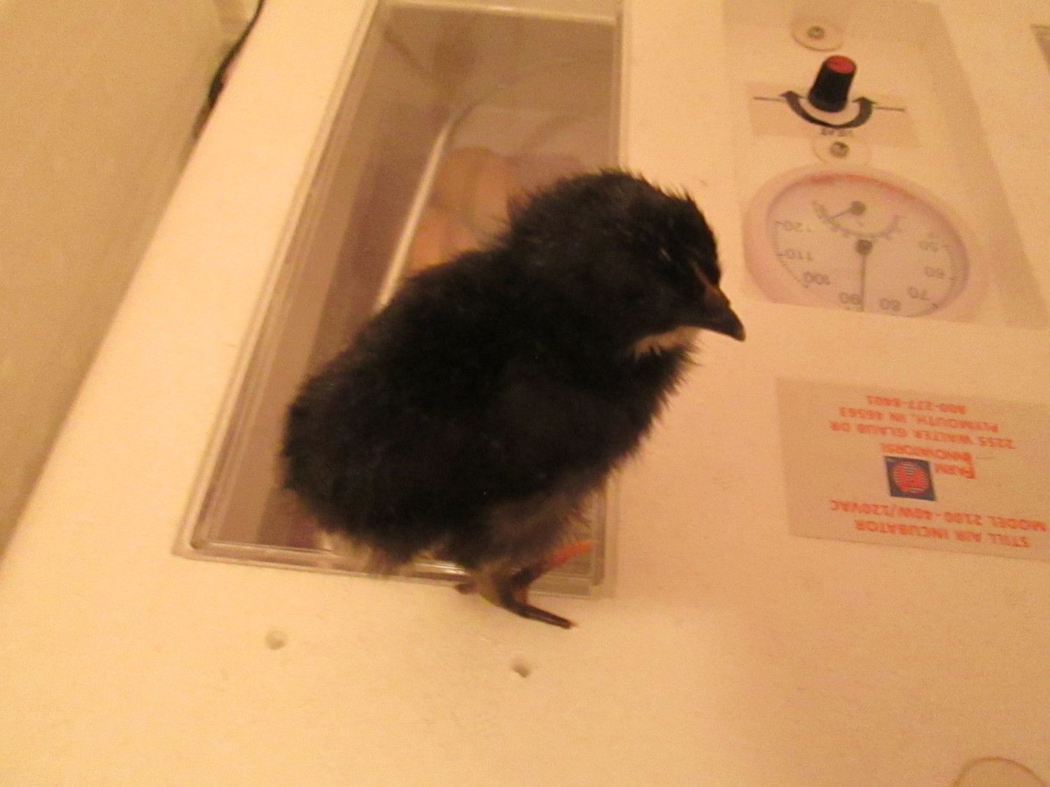 I have 5 new babies. Black chicks, and white from the white leghorn..of course. I am hoping that these blacks are OE's. I was soo surprised to see blacks. Where is the blue? Blue Copper Maran dad. Hmmm..I am thinking they will have the red go down the head and neck as I am seeing brown spots on the first one. Surprise here, they are all looking like girls but one so far. I have one more in a white egg working on it..white feathers...yep.