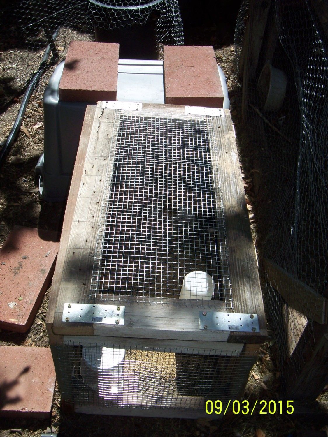 I'm so glad my husband made me a new chick brooder for the five new chicks we got. It hinges on the top so it is super convenient to open, get the chicks in and out and fill the food and water. It's attached the to Rubbermaid tote so they have a nice place to go at night or during the rain. I love it much more than what we had before.