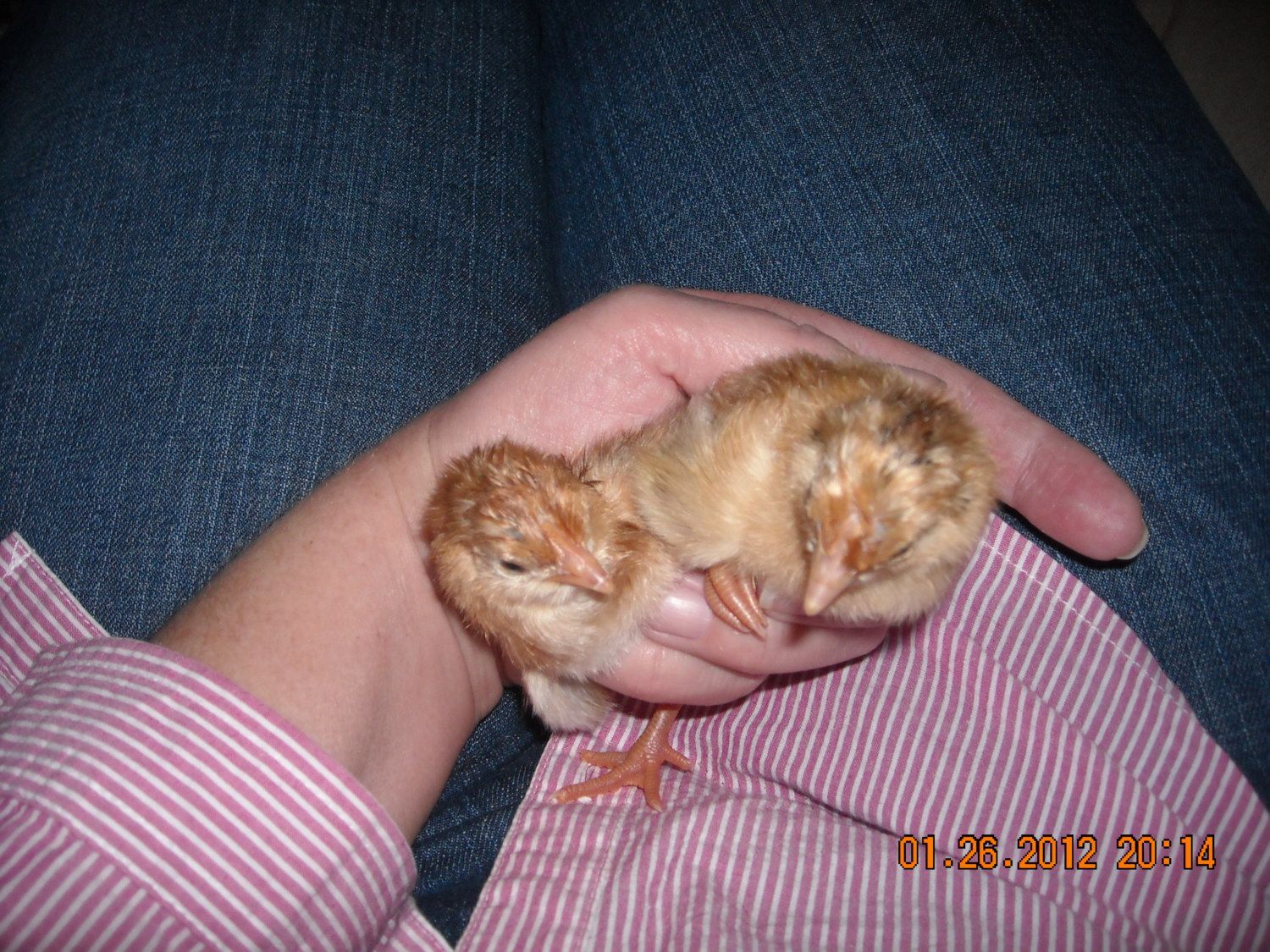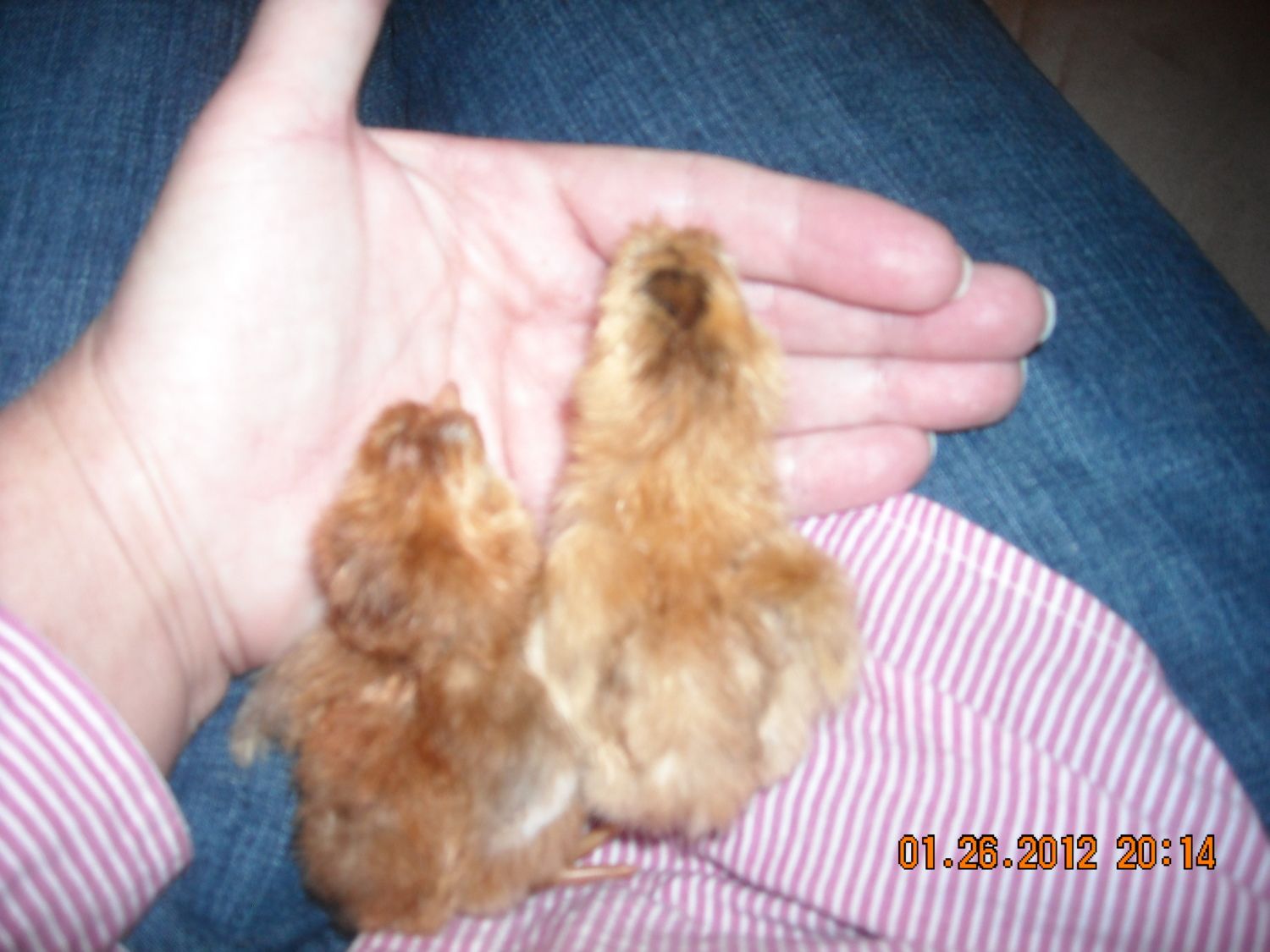 Here are the two little barn yard mixes I kept. Big chicks.. I think one is a girl, and one is a boy, my guess. :) You can see the that one has some black in it, should look pretty when all grown up. Hoping that is the girl.