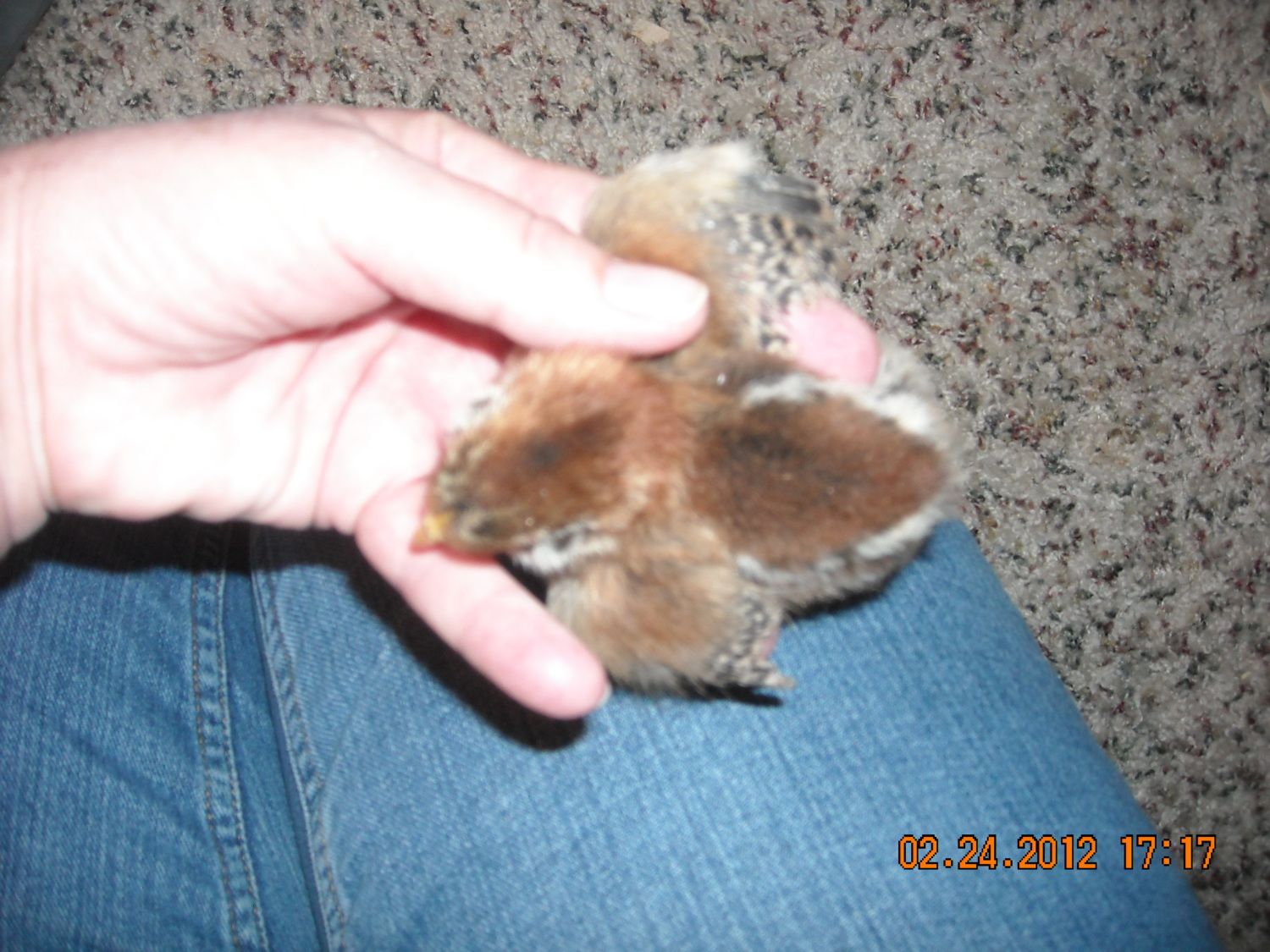 Lots of fun new ones for you! Sounds like you are getting a cute flock together. My BR laid just shy of 6 months. Her eggs sure are nice though, worth the wait. Hope you get your brown girl from the puffy faced bunch! I may switch out a couple of my last year's CAL ranch hens this summer, those guys are STILL out there fighting and eating feathers. They stop for a bit if i remove one, but then back at it a week or two later. Thank goodness they mess with each other, and not with the new ones so far. My two black EE just ignore them. Here is a pic from my web cam of my wyandotte. Look at her tail! One feather left So sad! She was so beautiful before. Much happier with my newer chickens and my IFA chickens from last summer.