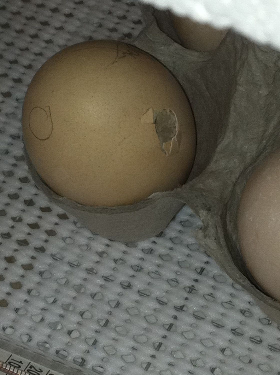 The chickie has made a little bit of progress. It's hard to tell in the picture, but she has broken through the membrane and it's like a flap. She's currently working on another hole in the membrane at the very bottom of the pip.