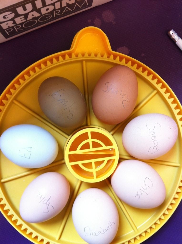 Speaking of olive eggs, wanted to show you all the eggs I set. Isn't "Emily" beautiful? (I begged the kids to give the eggs mainly girl names this time around)