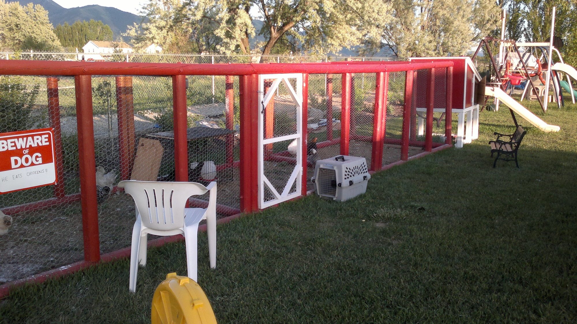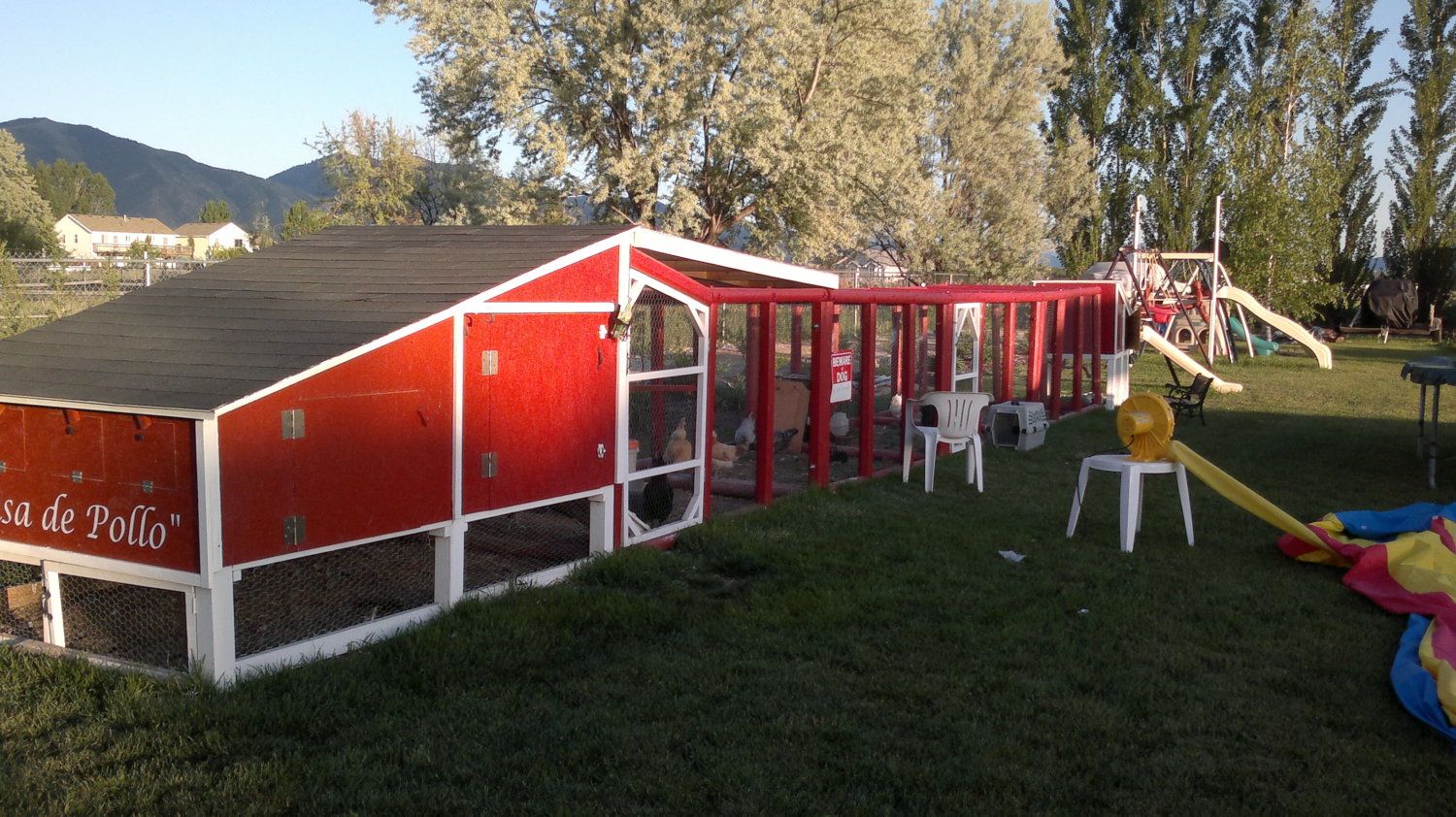 The whole deal----big coop "La Casa de Pollo"on left little coop on right