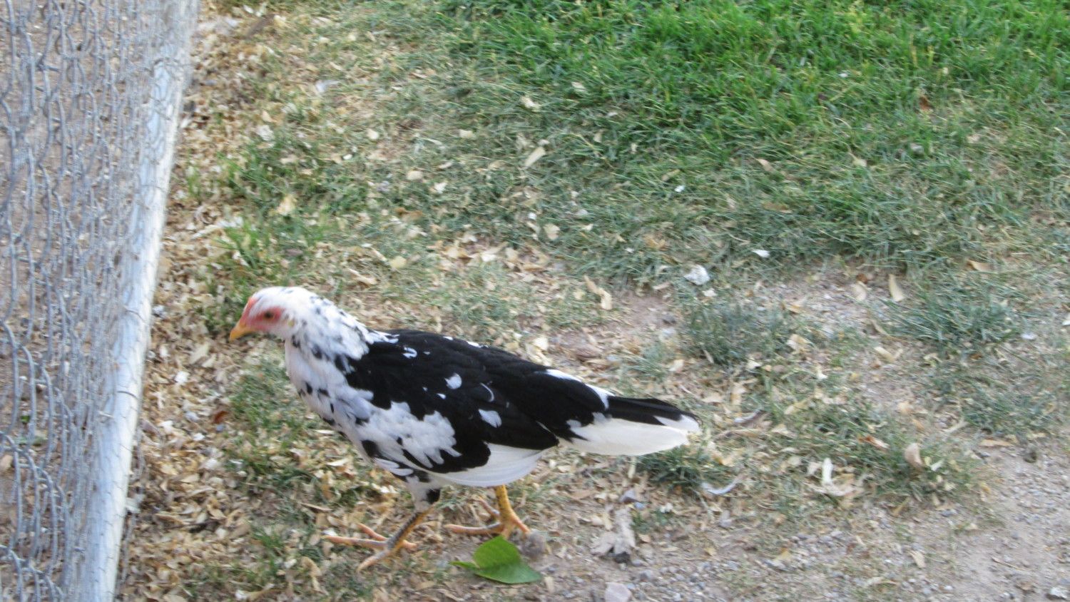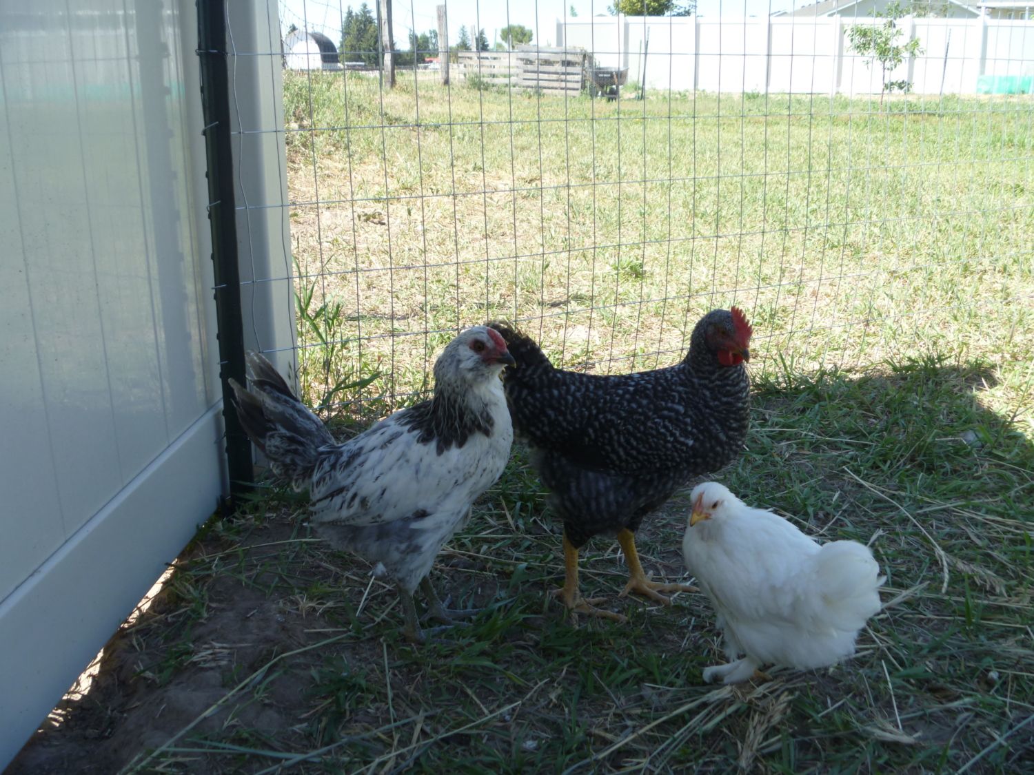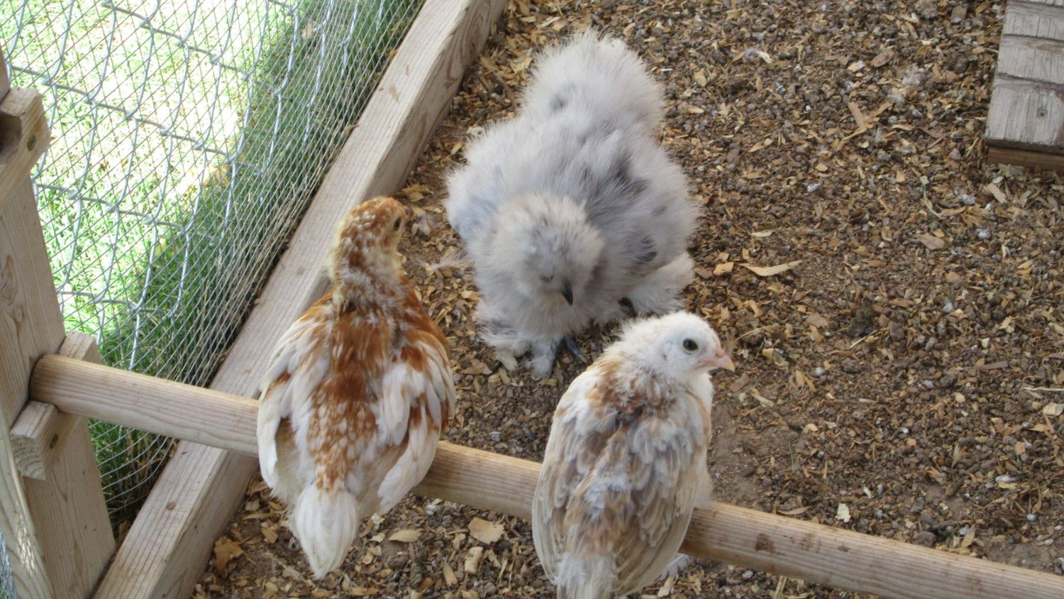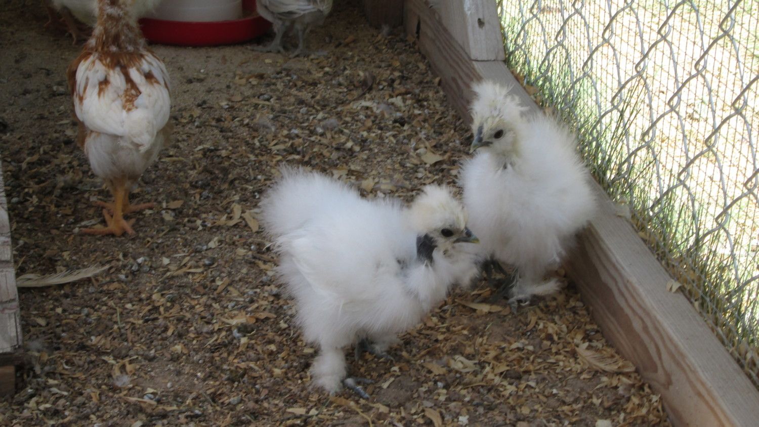 The sexlink walking away, the showgirl, and another white silkie that I'm watching. Love the hairdo