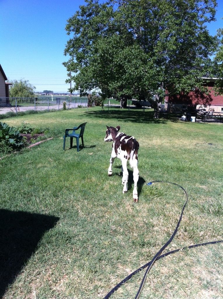 I was out collecting eggs, and discovered this little guy had escaped from my neighbor's yard. She's leasing her pasture to a guy who is putting his new calves there until they're weaned. Houdini, as I've named him, managed to somehow get around 2 different fences (one being 5' tall). NO CLUE how he did it.