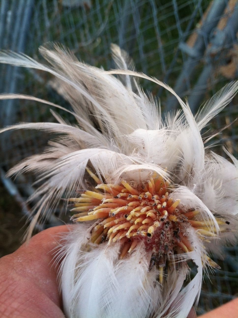 So some of you may remember Rocco's head being stripped clean. Well we figured out what was happening. While out in the yard, Sasha noticed Rocco's head appear to pull backwards out of the corner of her eye. She watched closer to see one of the hens grabbing hat feathers and pulling. The worst part was Rocco just sat there and let her pull, over and over. So the mystery of the missing feathers has been solved. Rocco has been separated from the hens for quite a while now and here are the before and after pictures of his head. Boy does it look interesting as the feathers start to grow back in.