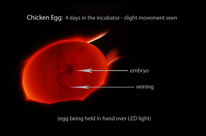 If you have a very bright candler and a pitch black room...on day 4 you will see this...if it is developing.