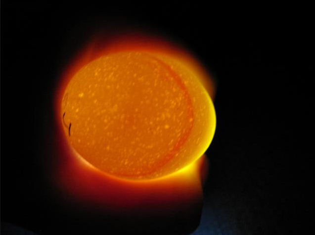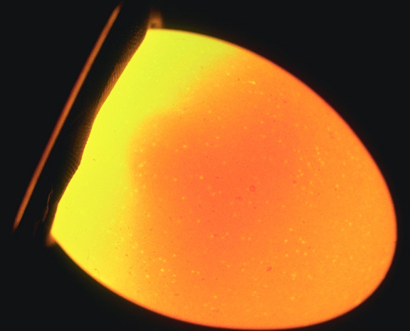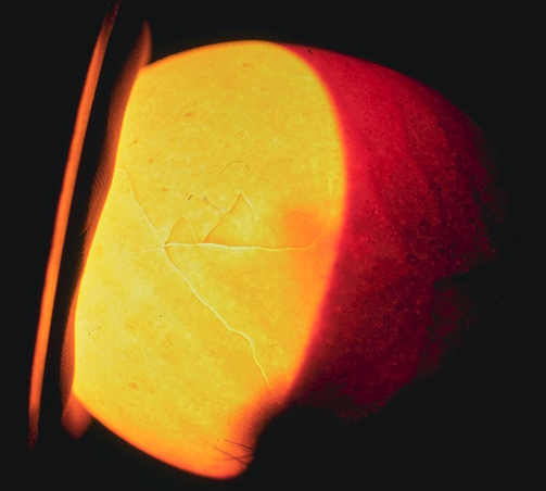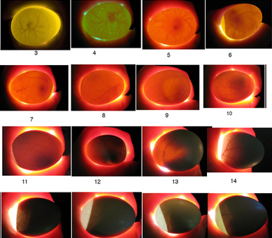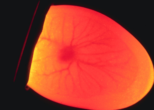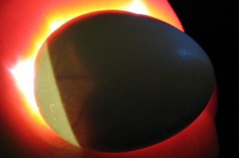 This is a clear egg, notice it is all yellow with dark masses or red lines. This is what an egg from your fridge looks like when candled.