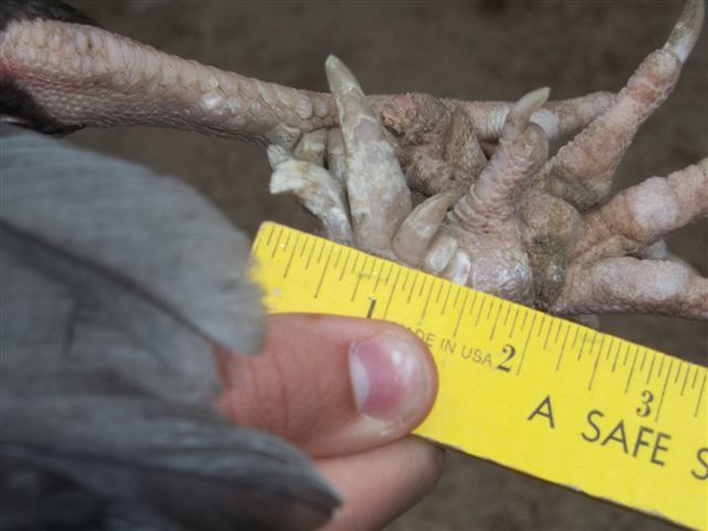 I couldn't do the ruler thing, but I can tell you that this bird's spurs are every bit of a half inch in diameter. You can see the relation to my fingers, keeping in mind that I am a big guy, and have some big meat hooks on me. lol This is on a 9.5 lb Thai cock, and trust me when I'm telling you that you don't want to be other the other end of this bird if he had the inclination to shuffle you.