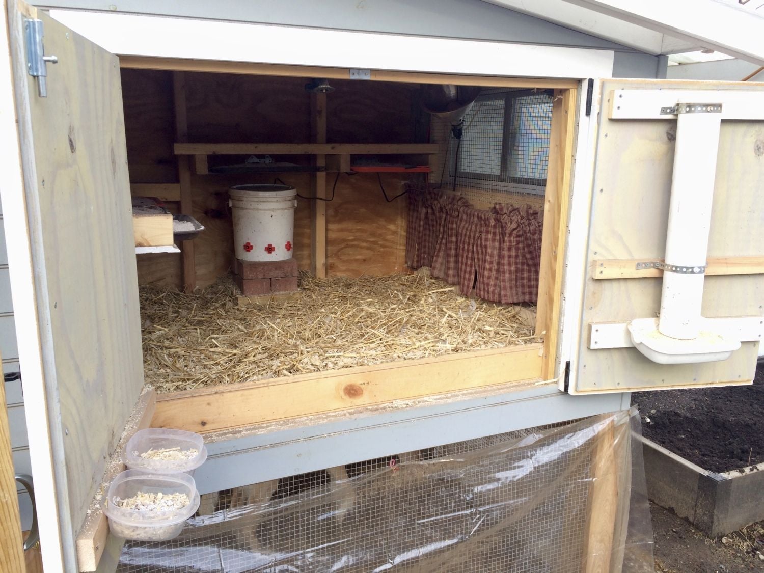 We also tackled the frozen water issue with a trick i learned on BYCs using a 2.5 gal bucket with horizontal nipples and a small aquarium water heater! (i plug the water heater into a thermostat plug adapter so it wont come on till the temp drops below 40.)