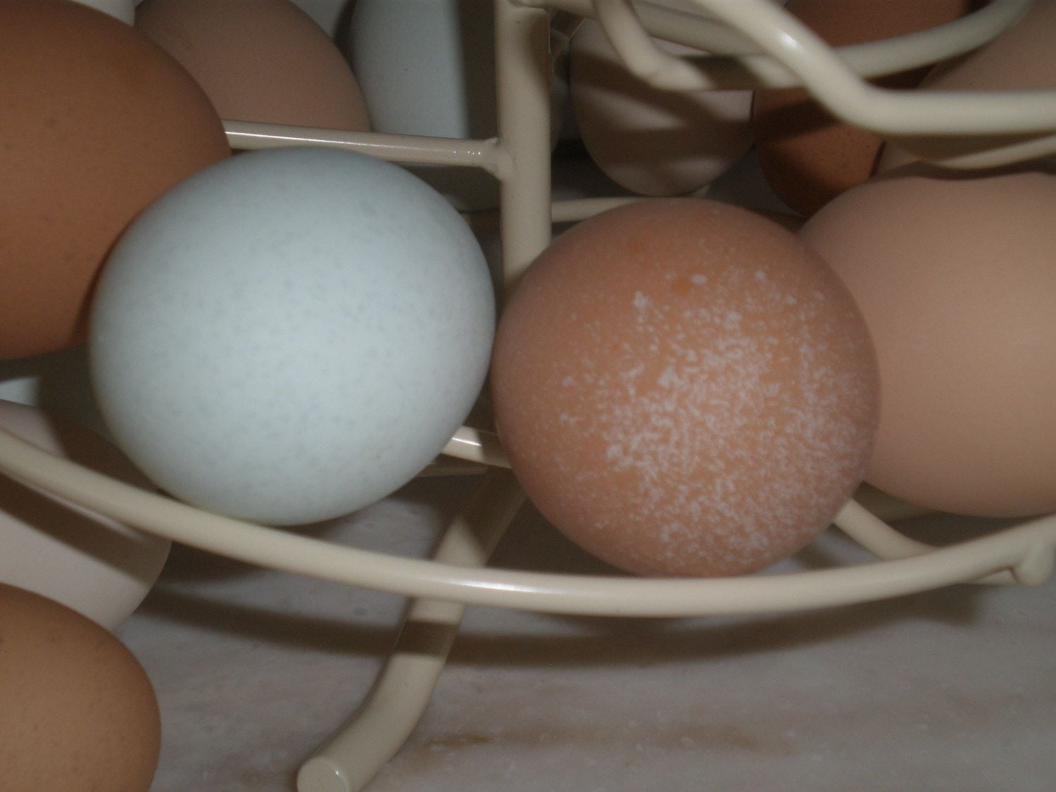 I have 4 hens, 2 EE's, a BO and a RIR. The other day I went out to collect eggs, and found one I cannot explain. The RIR lays darker brown eggs, one of my EE's lays blue eggs. On the end of the RIR's egg, there are BLUE splatters, quite a lot actually. I am at a loss as to how this could occur. Any ideas out there? Anyone had this kind of thing happen?