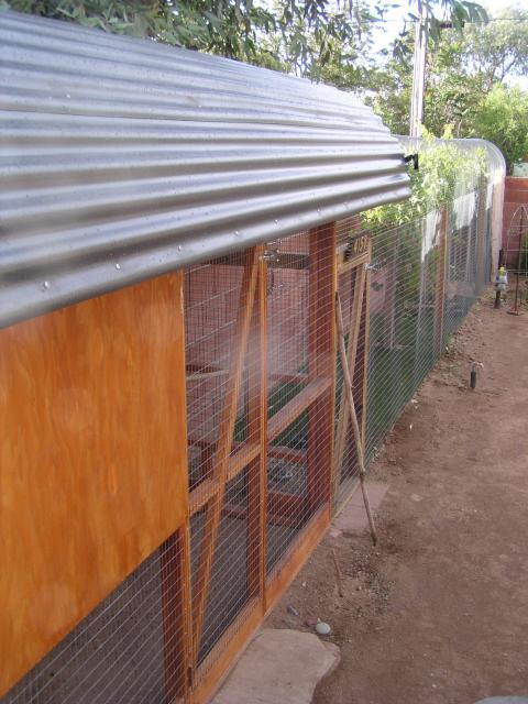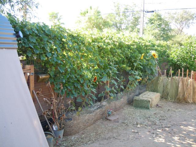 Grapes work well for us here. We have three vines inside the 40' run. Once they get established they grow extremely fast and ours cover the run before the terrible heat of summer arrives. These pics were taken a couple of years ago. There were nearly twice as many vines covering the run/coop last year.