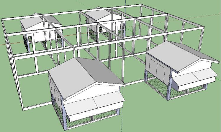 here's my design i'm working on... each house is duplex, divided down the middle to accommodate 2 pens at a time. the plan is a bit incomplete, but there will be doors to walk into the pens to the sides of each house.