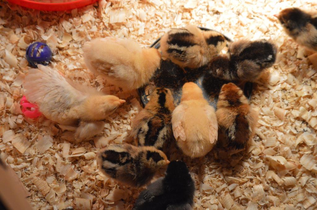 We got 6 more chicks today from the pullet bin at TSC. I think they may be Easter Eggers. We have a nice assortment now to be able to choose who we want to keep for our flock. :) Here's an overhead photo of the newbies here. (chipmunk looking ones and the one at the top right) Thoughts? (will be posting a thread soon. Just curious now, hehe)