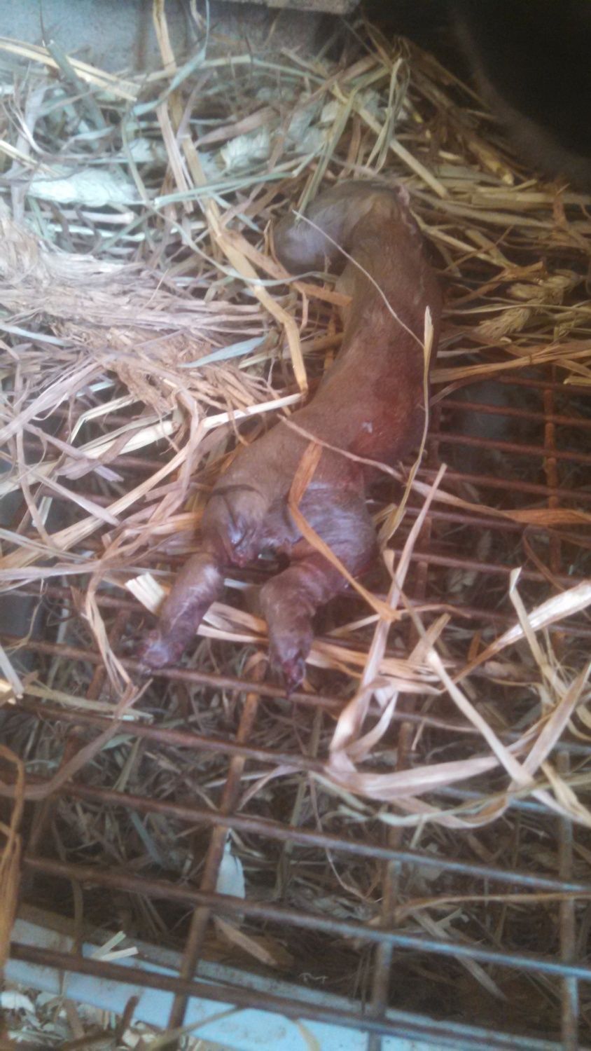 Sometimes first mothers get it wrong...this poor guy was deformed and possibly born early. I was not there upon her birth as I wasn't expecting anything until mid February!! But now she's inside so I can monitor her. It could have been DOA.. it could have died after birth. It appeared to be a stuck kit. She's a very nice rabbit and let's me pet her all the time. She's a cute little model. She could have overgromed him too. Lots of times first time mothers kill their babies...they trample them..eat them...nest after birth therefore digging where babies are. Look it up. :)