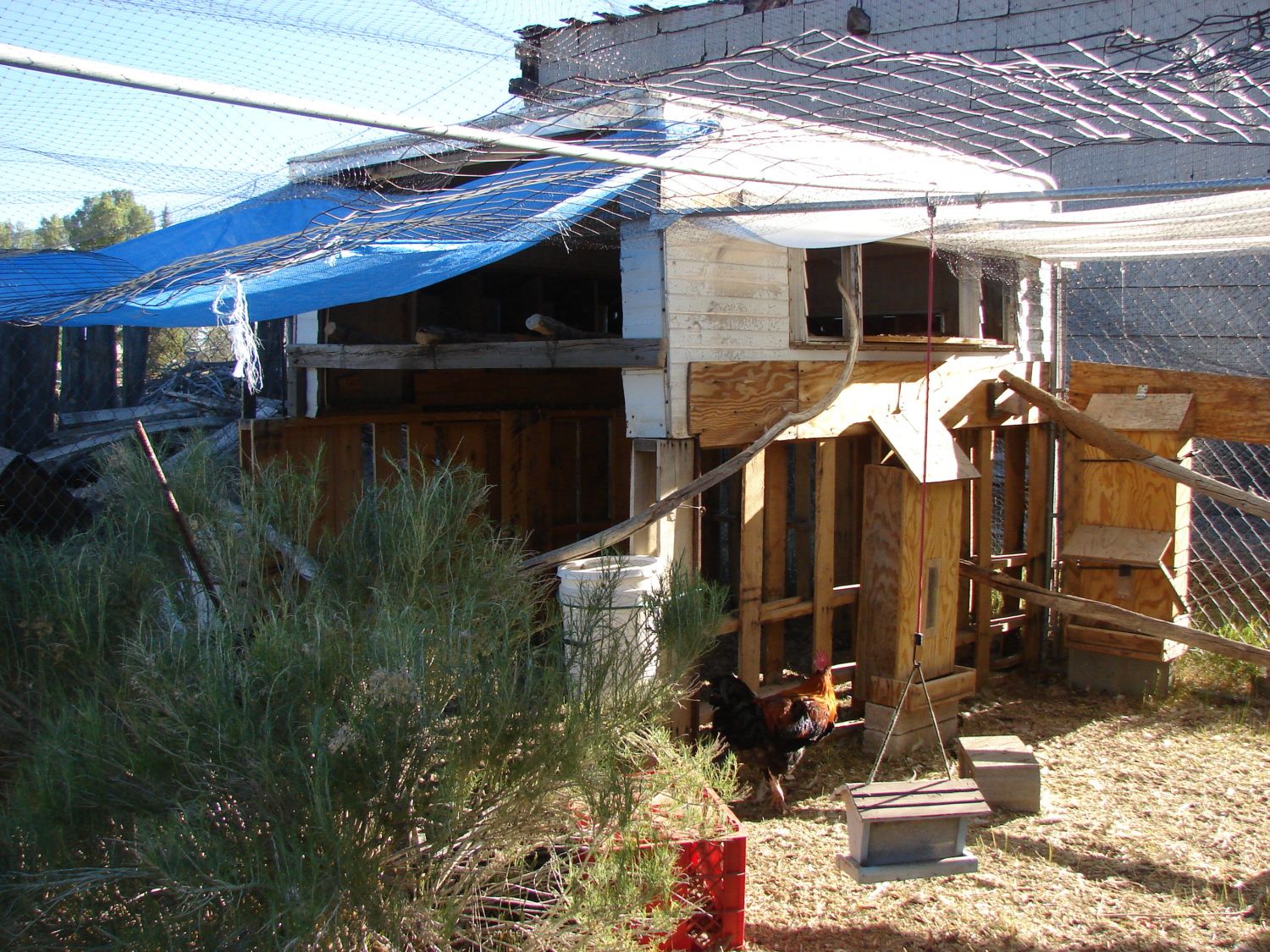 So, pictures were promised. This is the summer setup. The coop. The windows are nestboxes except the through and throughs here. I really wanna get a poop hammock for this and have already gotten rid of the field fencing on top in favor of more netting. I also intend to switch out the feeders with trigger feeders to minimize wild birds getting my feed.