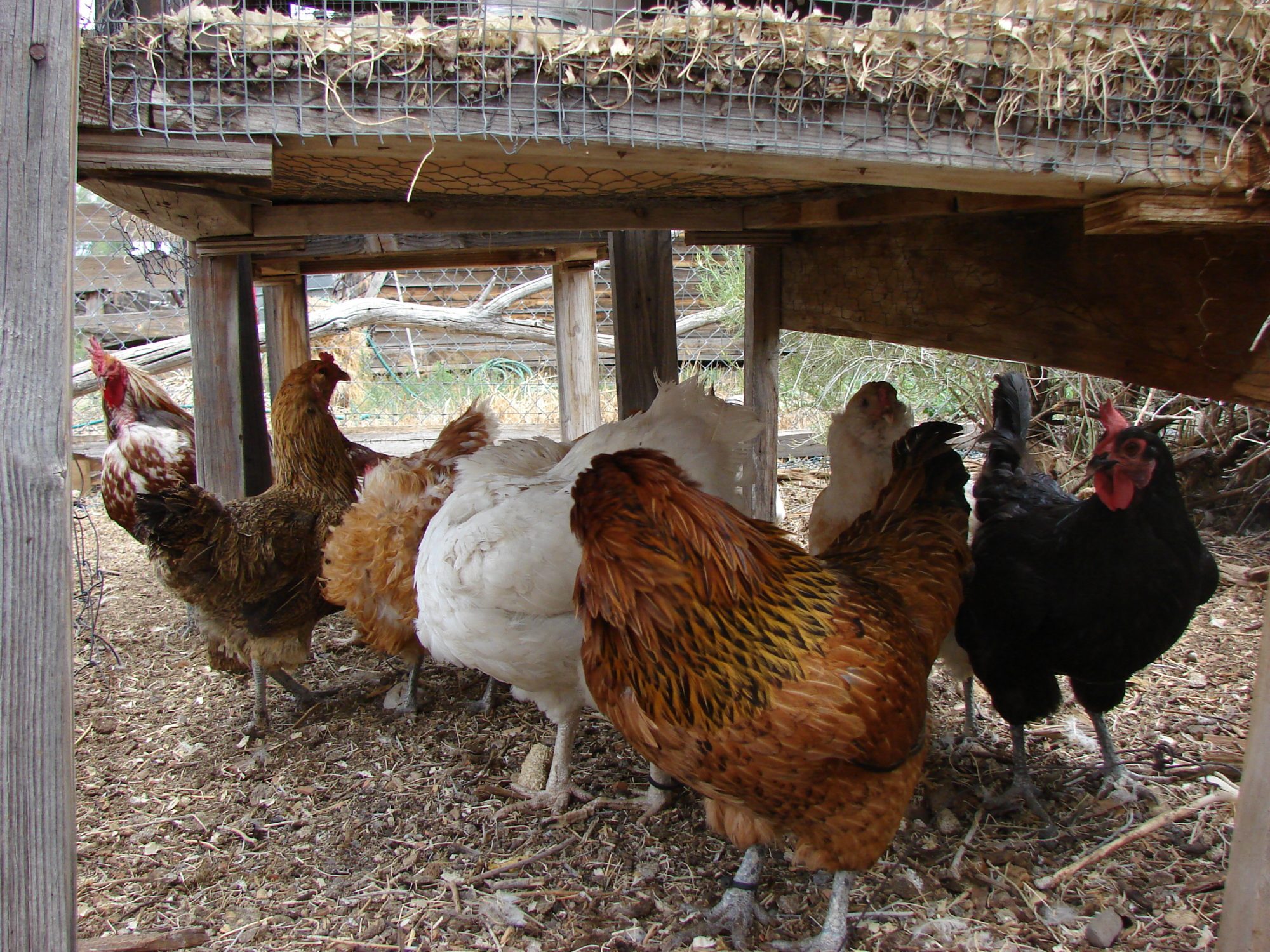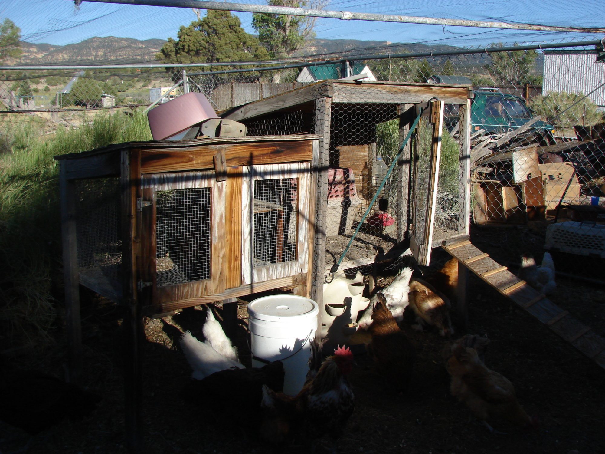 These are old rabbit hutches that we are using as broody boxes. Open during the day and closed at night. There is a whole lot of rabbit brush in the run which the chickens love. They use it for shade and protection as well as for food.