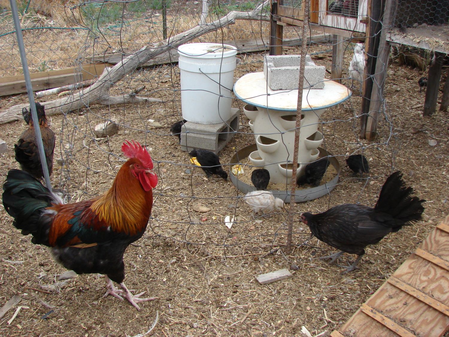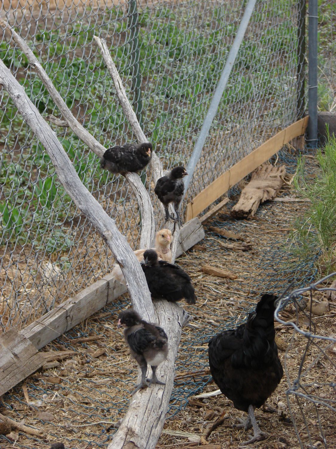 I ended up putting the field fencing around the strawberry pot feeder to keep the big chickens out of the chick feed. It's non-medicated but they act like it's crack or something. This way the littlies have a safe place to eat and drink. Here's Casino and here brood. She still manages to squeeze in sometimes which is fine by me. Notice the branch in the background?