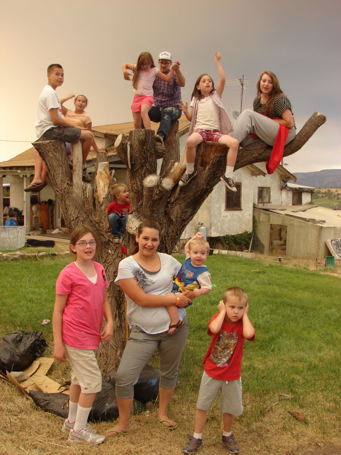 Along with visible falling ash we had a really weird orangy glow all around. I love this photo of our family tree, most of the nieces and nephews with the monkey's uncle, my youngest brother. They were encouraging the passing diesels to honk by pumping their arms up and down. I did it when I was young too. I love all the action and reaction in this photo! Check out the baby...and his 2 older brothers!