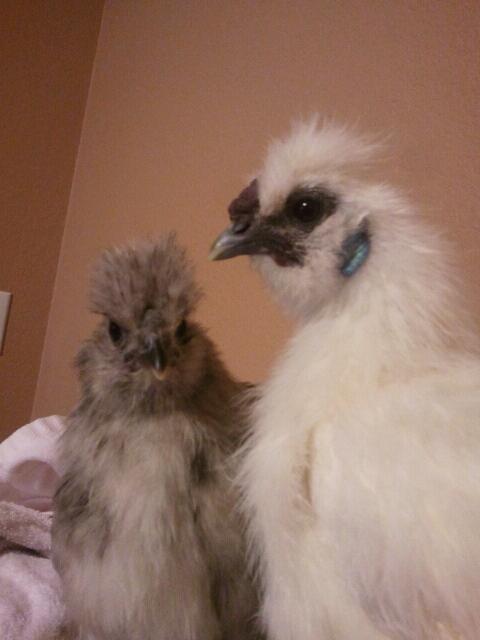 That said, a friend may need to send one of her Silkies to a similar camp if she does not find a home for him/her soon. She picked up two young ones a while back and keeps them as 'house chickens' .... Yes, diapers and all..... Both seemed to be pullets but one has started trying, desperately, to crow and he/she is causing havoc in the house. Heshe does not have a waddle or a prominent comb but makes a god-awful attempt at sounding like an injured alien of some sort. My friend was going to wait and see if the creature would lay but the sound is apparently just too off-putting. If anyone could offer a nice home for such a well placed Vegas Silkie, please let me know.... He/she is the white chicken in the picture and is 5 or 6 months old.
