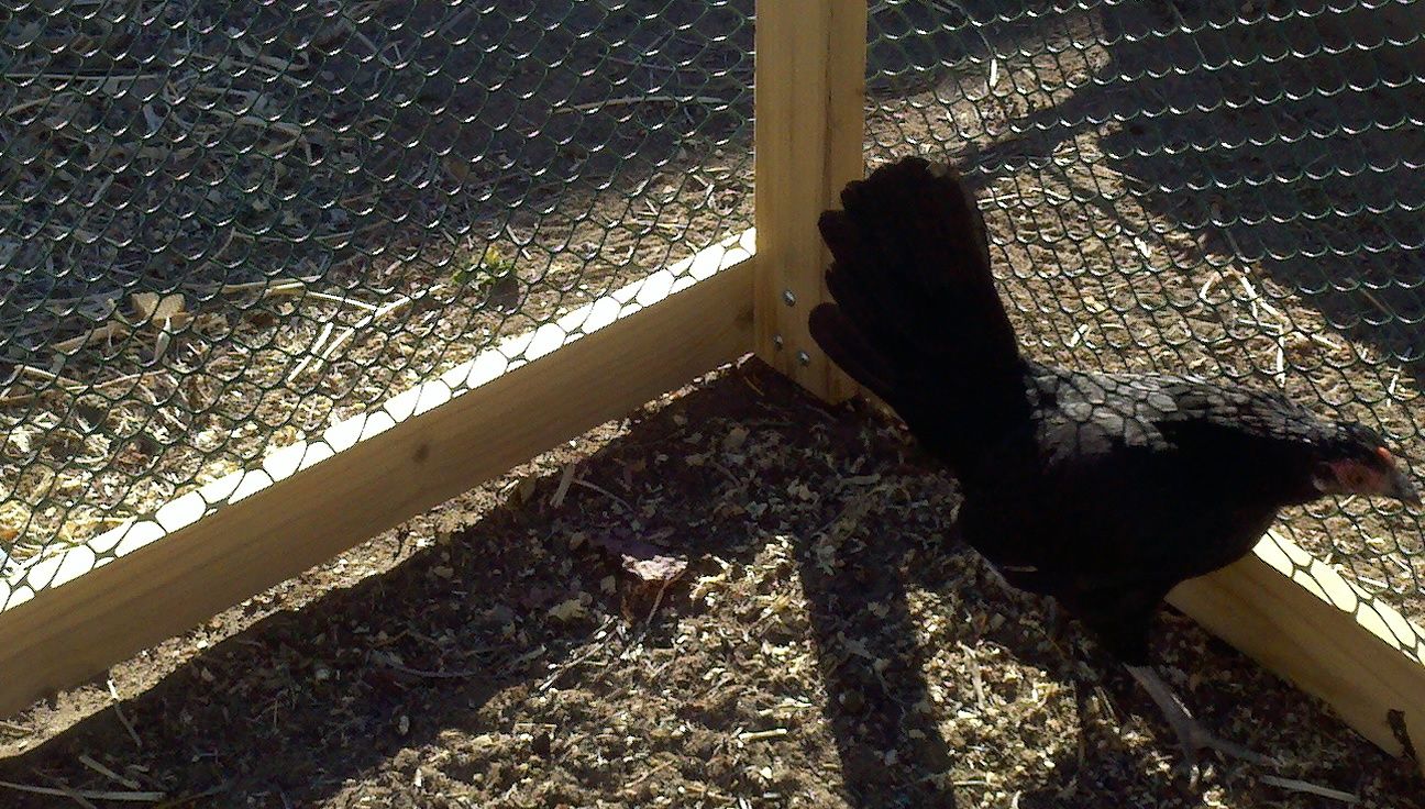 So now we have a coup, a small run, and a very resentful, skittish chicken!