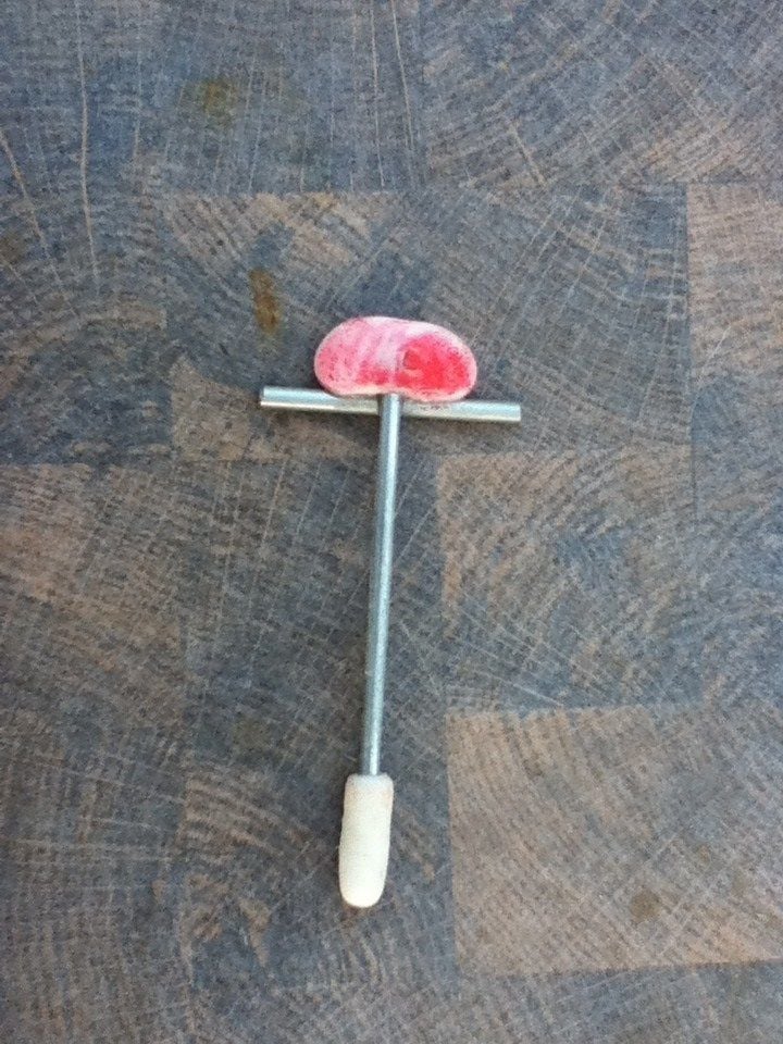 This is the trigger/toggle device. The wide flat plastic piece on top acts as a type of baffle. When the hen pecks and hits the bottom rounded end it makes the trigger move to one side releasing some pellets. The hen eats those pellets and pecks at the trigger again. It moves to the other side releasing a few more pellets. I think it helps keep them entertained as well as feeding them. As you can see, Sharpie markers are no match for chickens.The bottom part was red for about 2 seconds. At least I know they're pecking at it. So you get a bucket and drill a hole in the bottom for the toggle to fit through. We were worried that there would be excess feed sitting along the edges that the chickens couldn't access. We wanted to create a type of funnel effect so the more feed would flow.