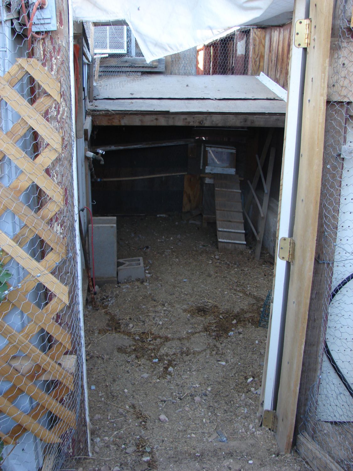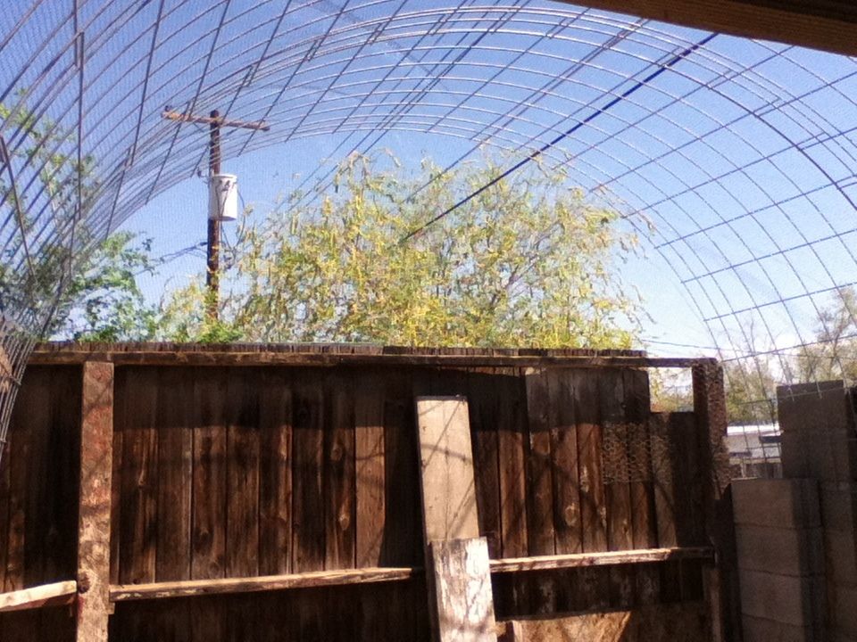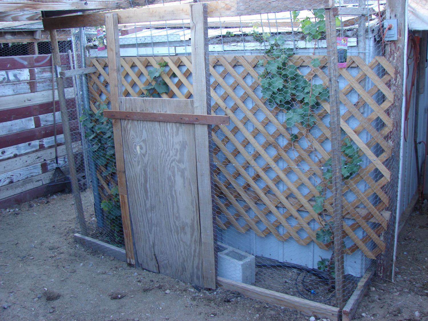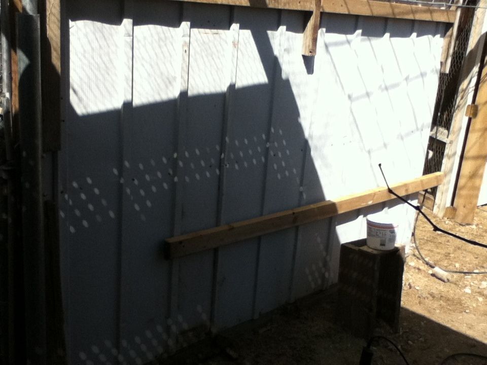 We needed to lessen the heat load caused by a white metal shed in the hot Vegas morning - miday sun. Happily, it was shaded in the afternoon by some peg boards we repurposed and placed on the top of the run along the coop.