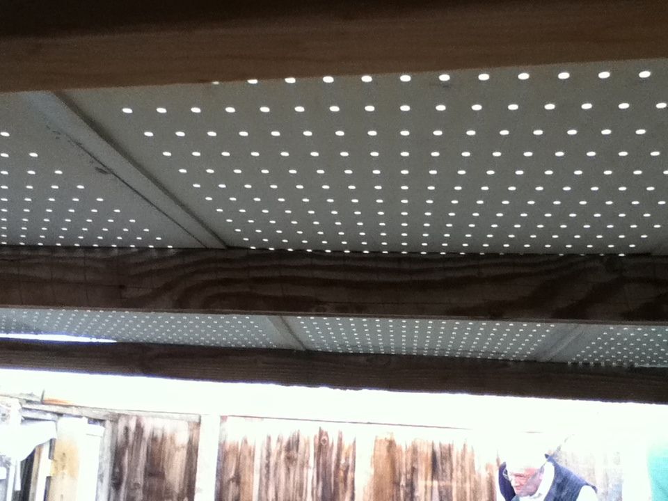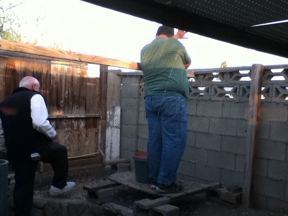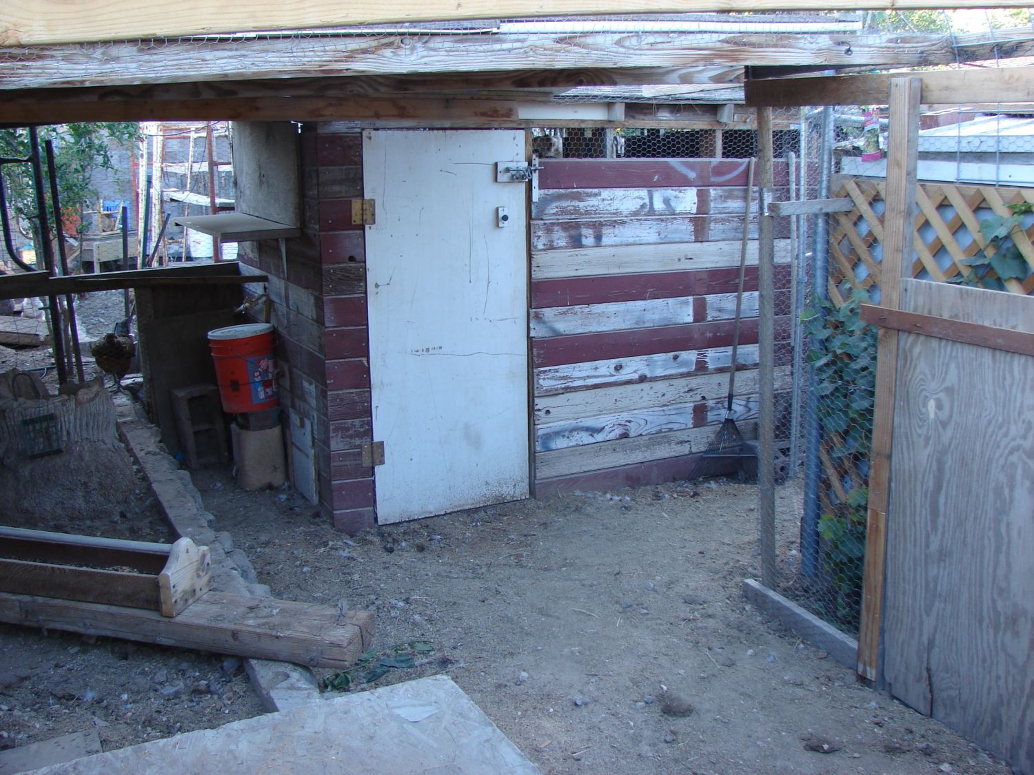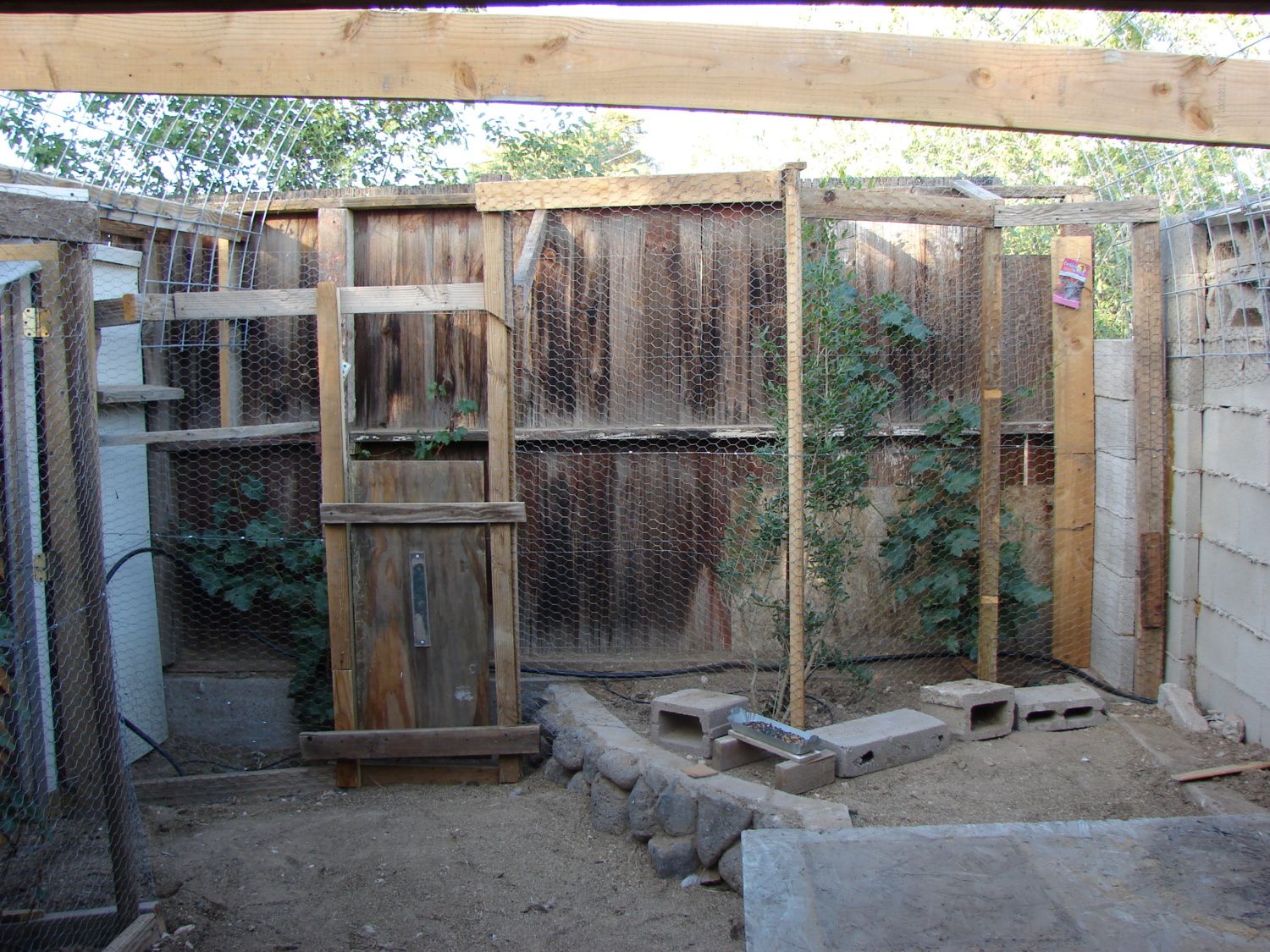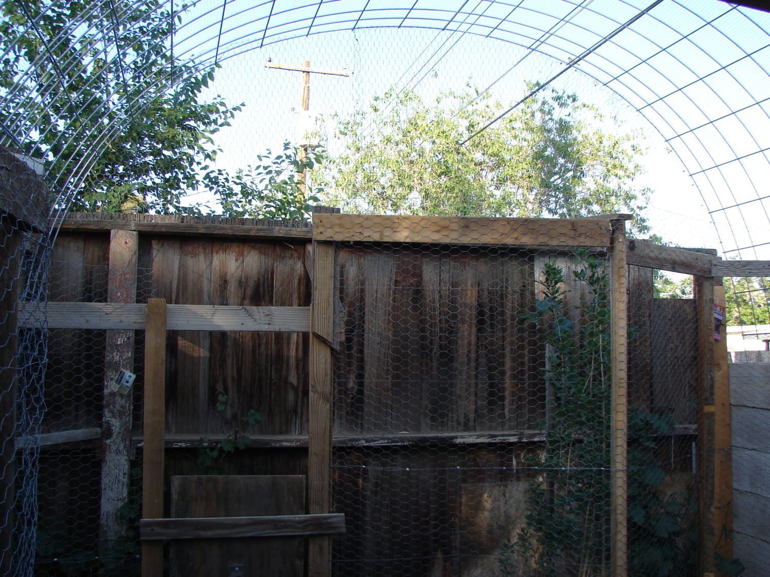 We needed to lessen the heat load caused by a white metal shed in the hot Vegas morning - miday sun. Happily, it was shaded in the afternoon by some peg boards we repurposed and placed on the top of the run along the coop.