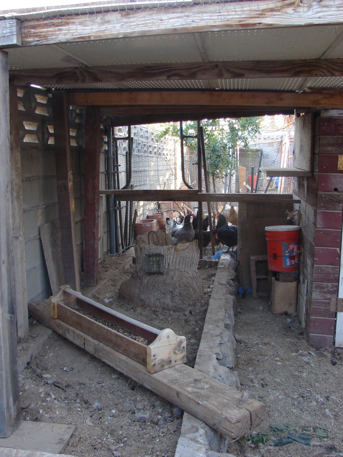 I like to get their food up off the ground and out of all the poo so my dad made this cool trough style feeder. Placing it up higher discourages them from standing on the sides and also the dowel he used along the top is loose enough to spin so they don't roost on that to eat.