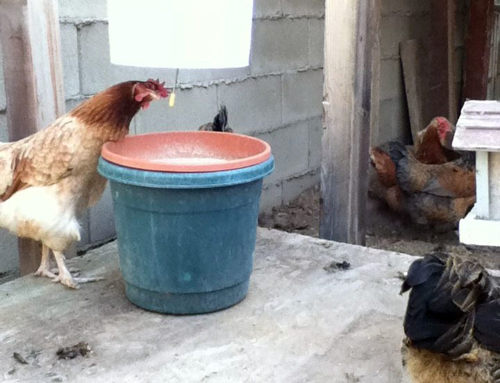 Eloise (or is it Hortense) the Wheaten Marans is kindly showing how to properly use the new feeders.