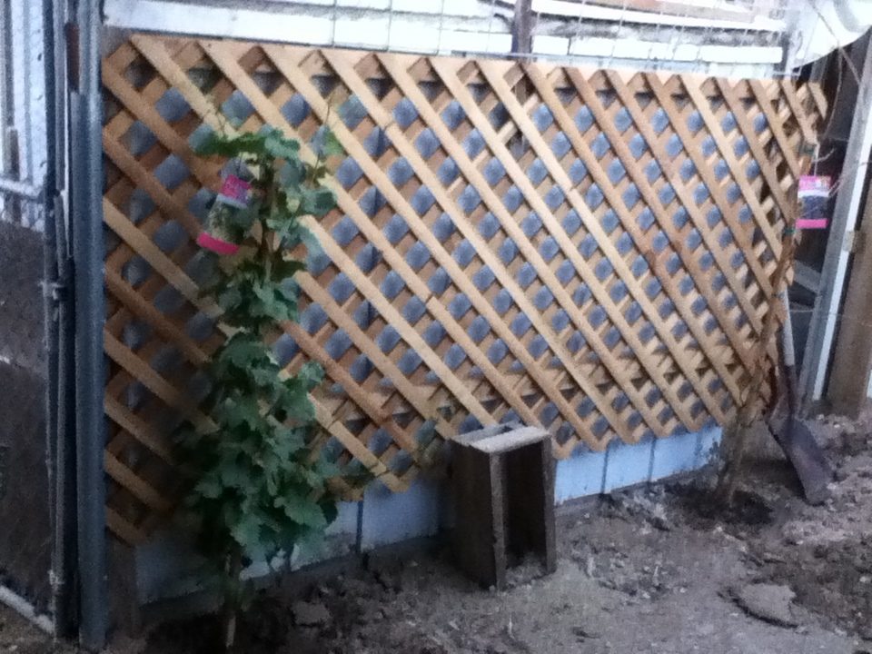 We hung a lattice work trellis on the side of the shed to create shadow and planted 2 wine grape vines. My dad wisely installed a cage around the new grapes vines or my chickens would've gobbled them up as soon as possible. We had to close the chickens in the garden area while we worked for everyones safety and sanity. I even placed a board blocking them from accessing the run through the landing they use to go to roost. Love the pop doors we have installed everywhere.
