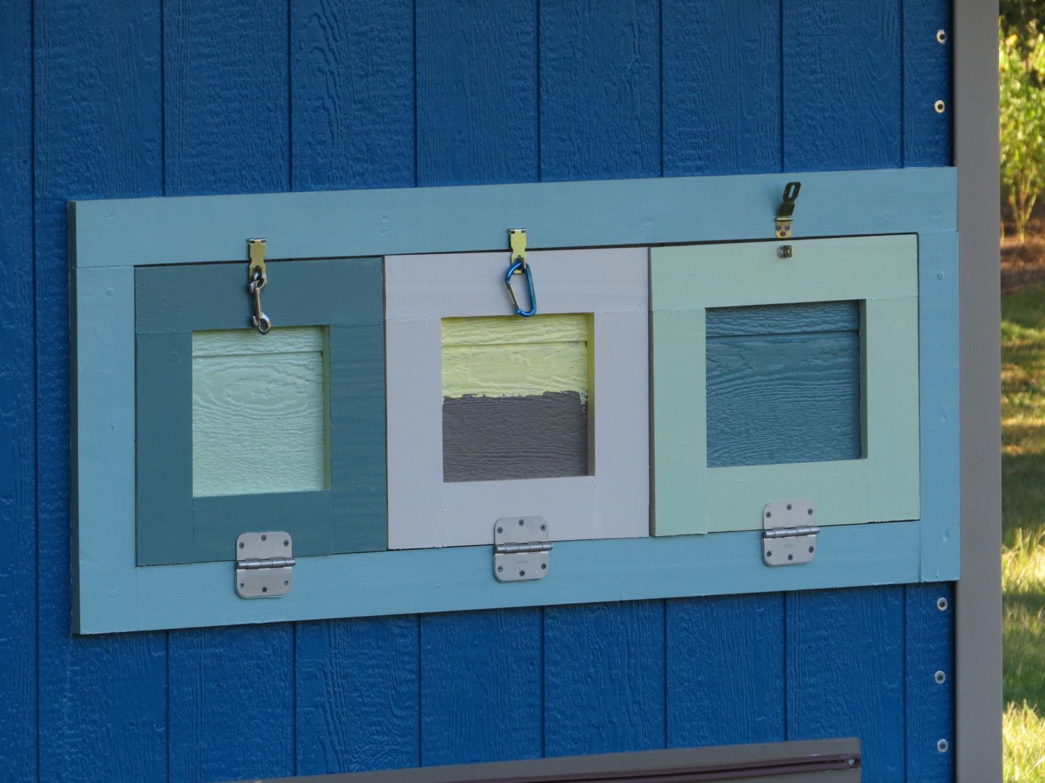 I'm not done with the coop & run yet (coop roof unfinished, and no hardware cloth or gate on the run), but I'm having fun figuring out the paint colors anyway. The nest boxes started out brown with a cream outline, but then I decided that was too boring with the blue coop and green run, so I mixed some other colors with the cans I still had.