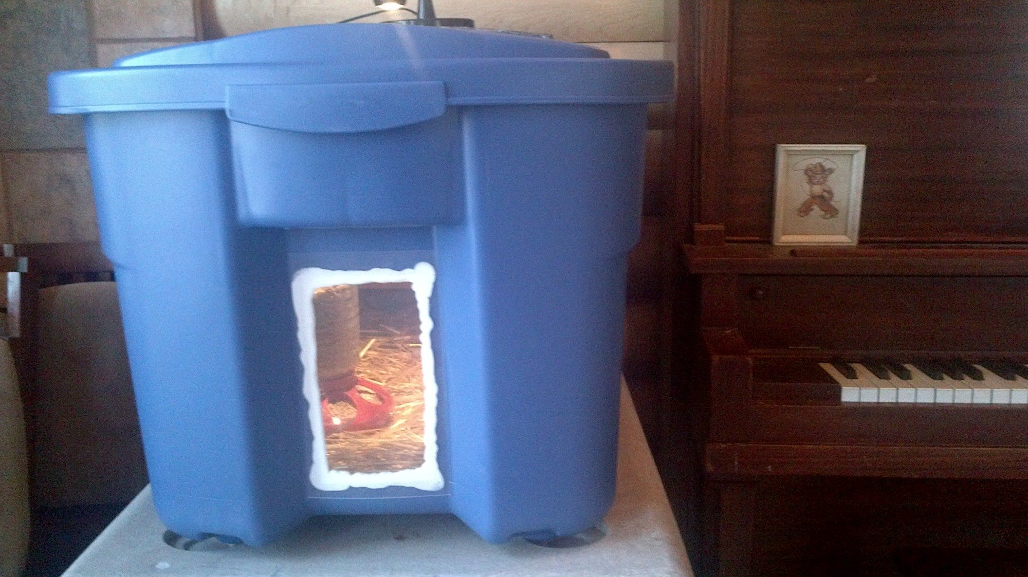 Brinsea ecoglow 20 brooder on the lowest level. Plugged in and warm (actually if you put your hand against the bottom its fairly hot. Is that normal?)
