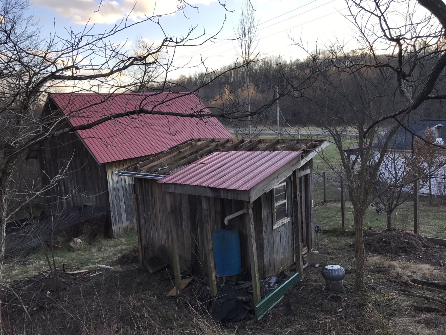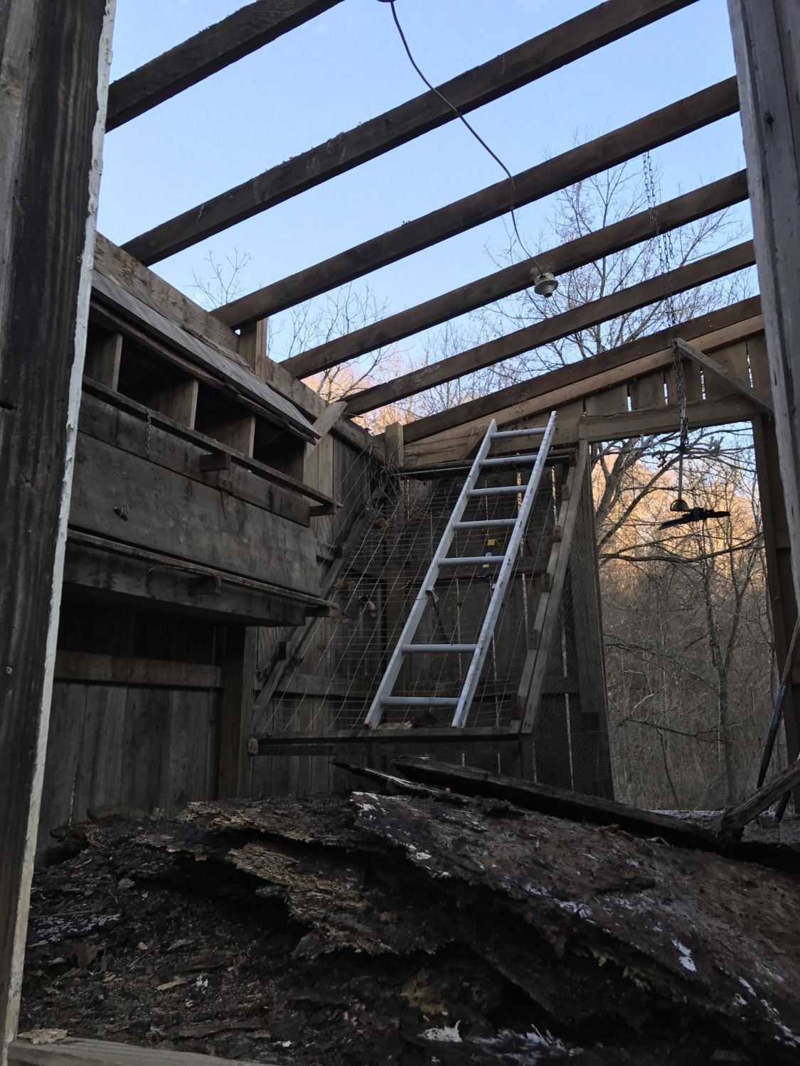Here are a few photos taken during my recent re-coop-eration efforts. I've since put on a new plywood roof and next up is the metal roof replacement, gutters, rainwater barrel, door repairs, and maybe a fenced run for 10-20 Buckeyes.