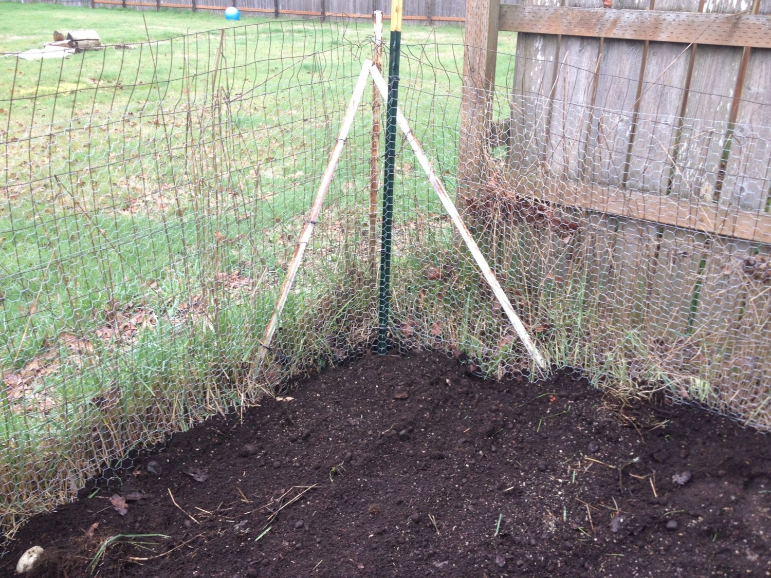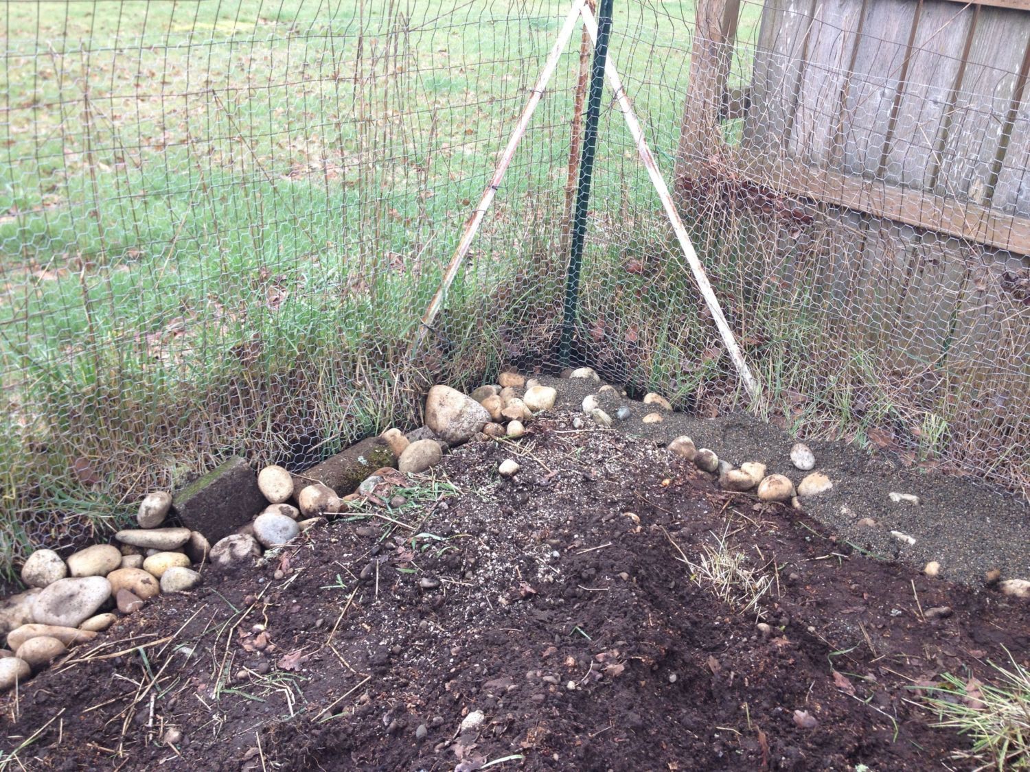So far I have 'pruned' the oak tree, cleared the junk from my 15'x20' space, dug the perimeter ditch, put down fencing..... Which is 1" chicken wire round three sides, and leftover fencing/mesh on the fourth. Then filled the ditch with big rocks, old bricks/cement.... Cleaned the yard of it all ;-).... And the buried the rocks with the dirt I dug up originally :-D
