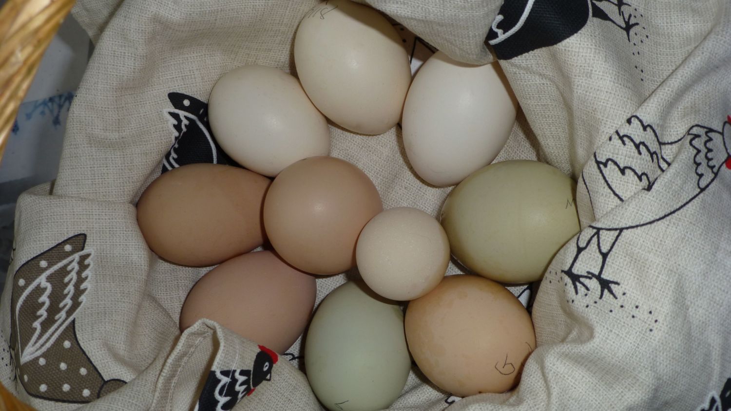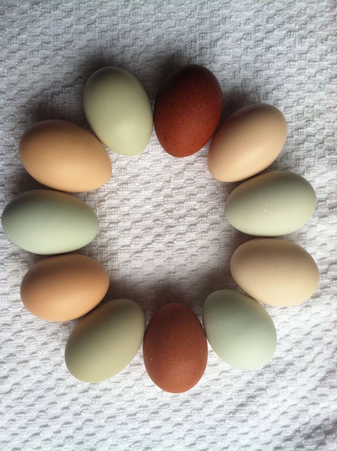 Two day's worth of eggs. From the top, clockwise: Hamburg pullet, two Hamburg hens, three EEs (Tertia, Ginger, and Quinta, in that order), two BLRW; in the center are the Australorp and the first egg from my Barbu d'Anvers.
