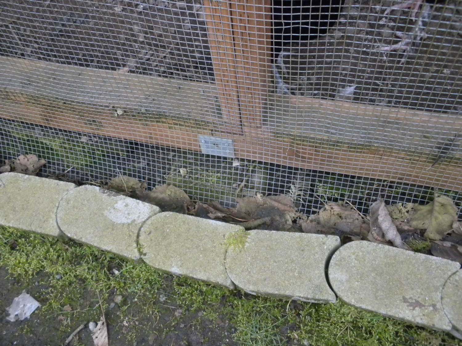 this is on the big run. We kept the base boards up off the ground on concrete feet, because the old run was sitting in the mud and the wood rotted. I filled in the gap with rocks but the chickens scratched all the rock out from under them so now it is mostly just the hardware cloth apron with paving stones and spikes keeping it in place. We also re used much of the hardware cloth from my old run. The old run was chicken wire reinforced with the hardware cloth after the raccoons tore their way in and killed half of my chickens.