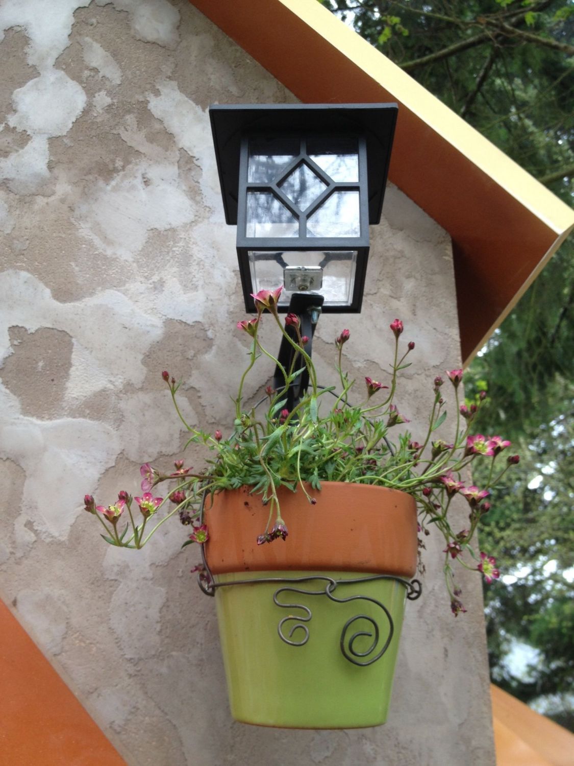 Thanks Hallerlake!!! Looks like the Purple Robe variety!! Oh, you are too awesome! That pot holder was just some wire DH had in the garage - I was mad I couldn't find a small enough paint pail to go under those lights ($3 solar path lights from HomeDepot and I just took the bottoms off and screwed them to a shelf bracket) so got some ceramic pots that matched our pallet patio and twisted the wire around the rim and then made a little handle for them to hang. (There are two, but DH was the one at home taking pics, and well, if you thought I was a not so great photographer