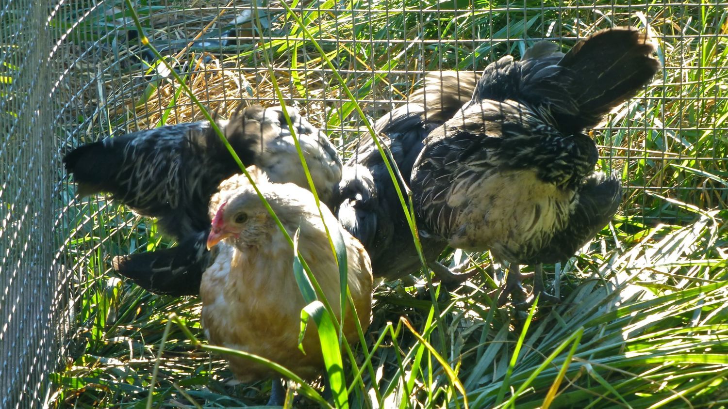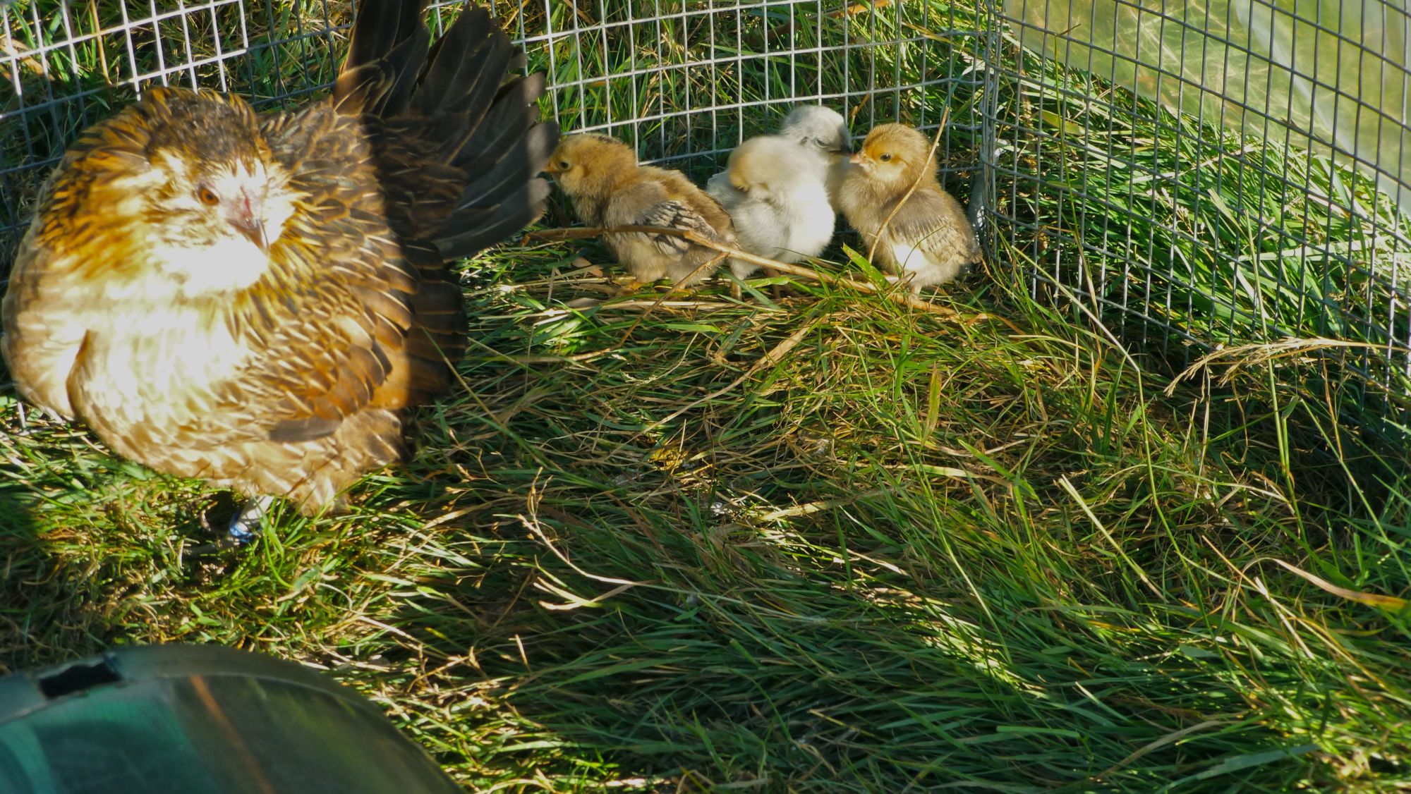 The big kids- unnamed as yet, I'll have to think about it for a while. There's a Splash Quail cockerel in front and a Blue Quail pullet in the very back that I'm keeping, and a silver Quail pair (pullet to the left, cockerel to the right) which I really shouldn't...