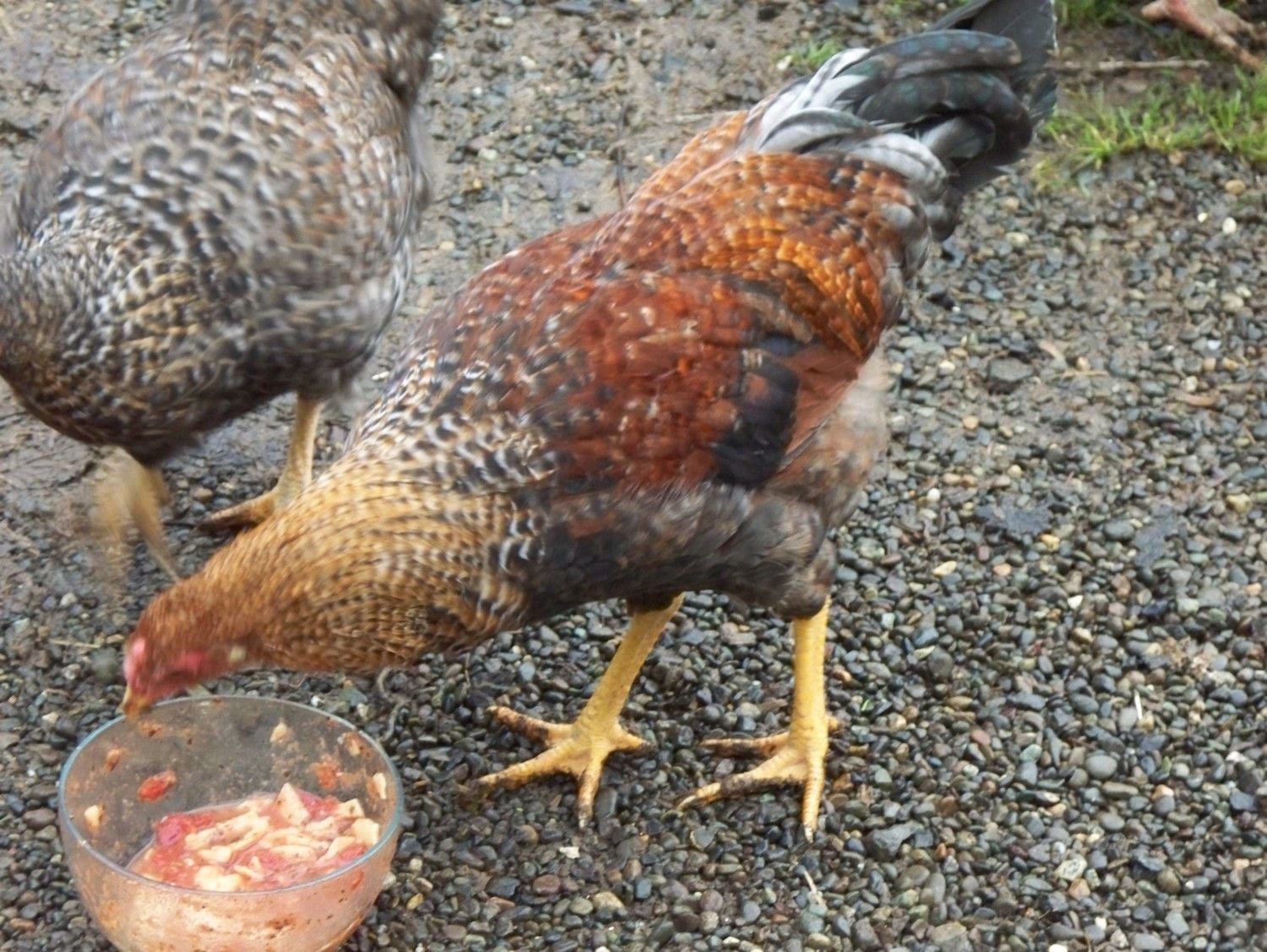 Far left is part of the barred sister that will be bred back to Buster, and then the crele son again~ NOTE his white earlobes, yellow skin & tail that is very leghornish