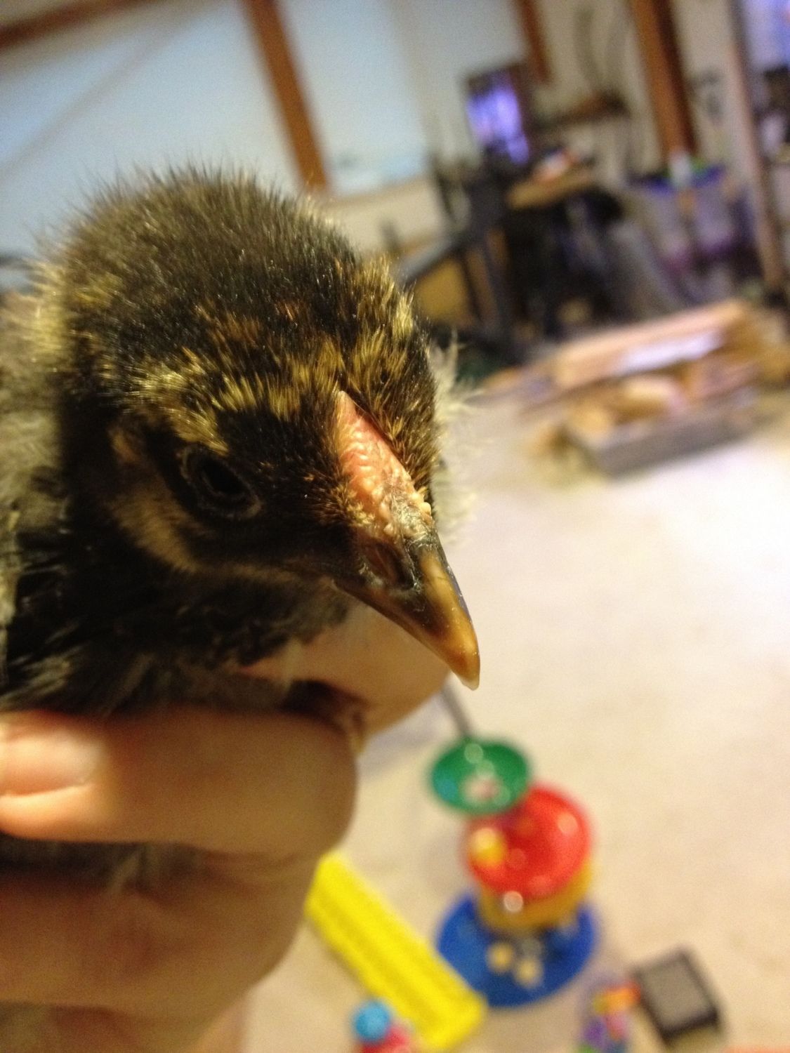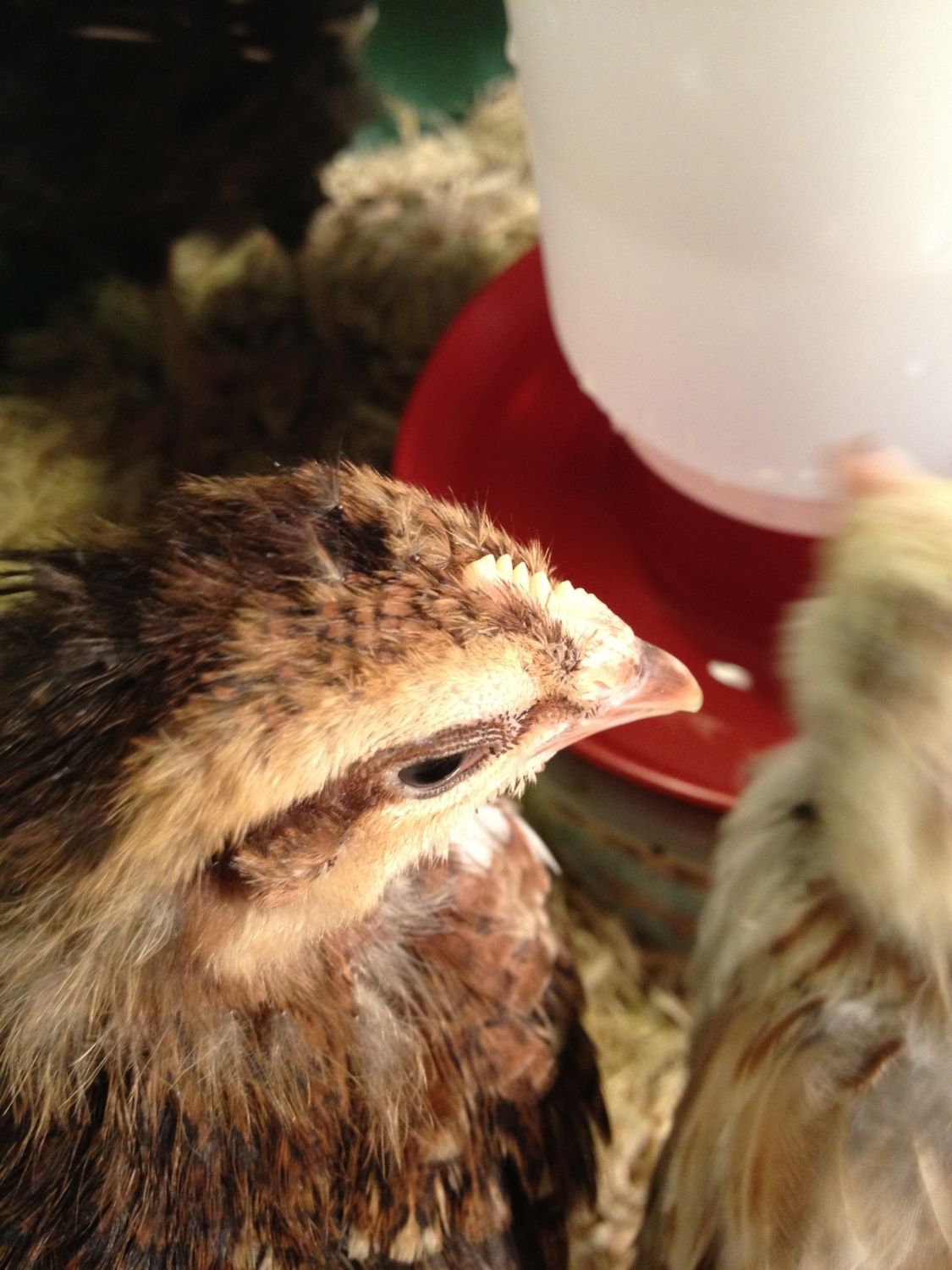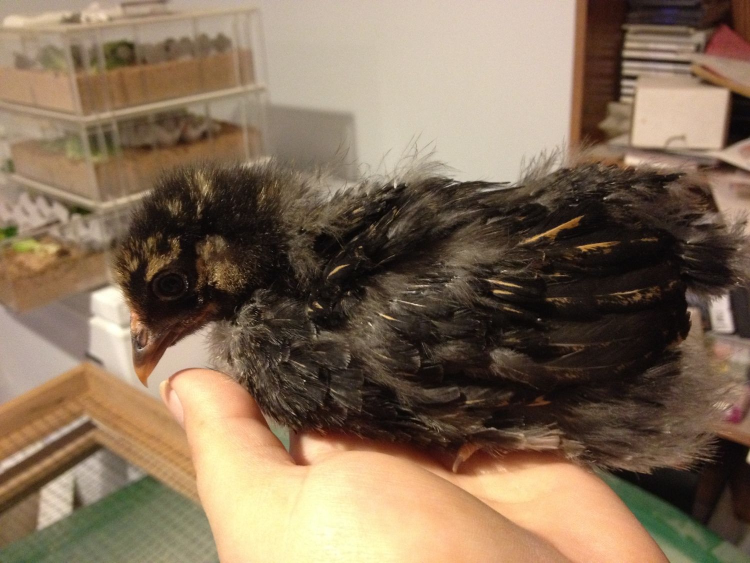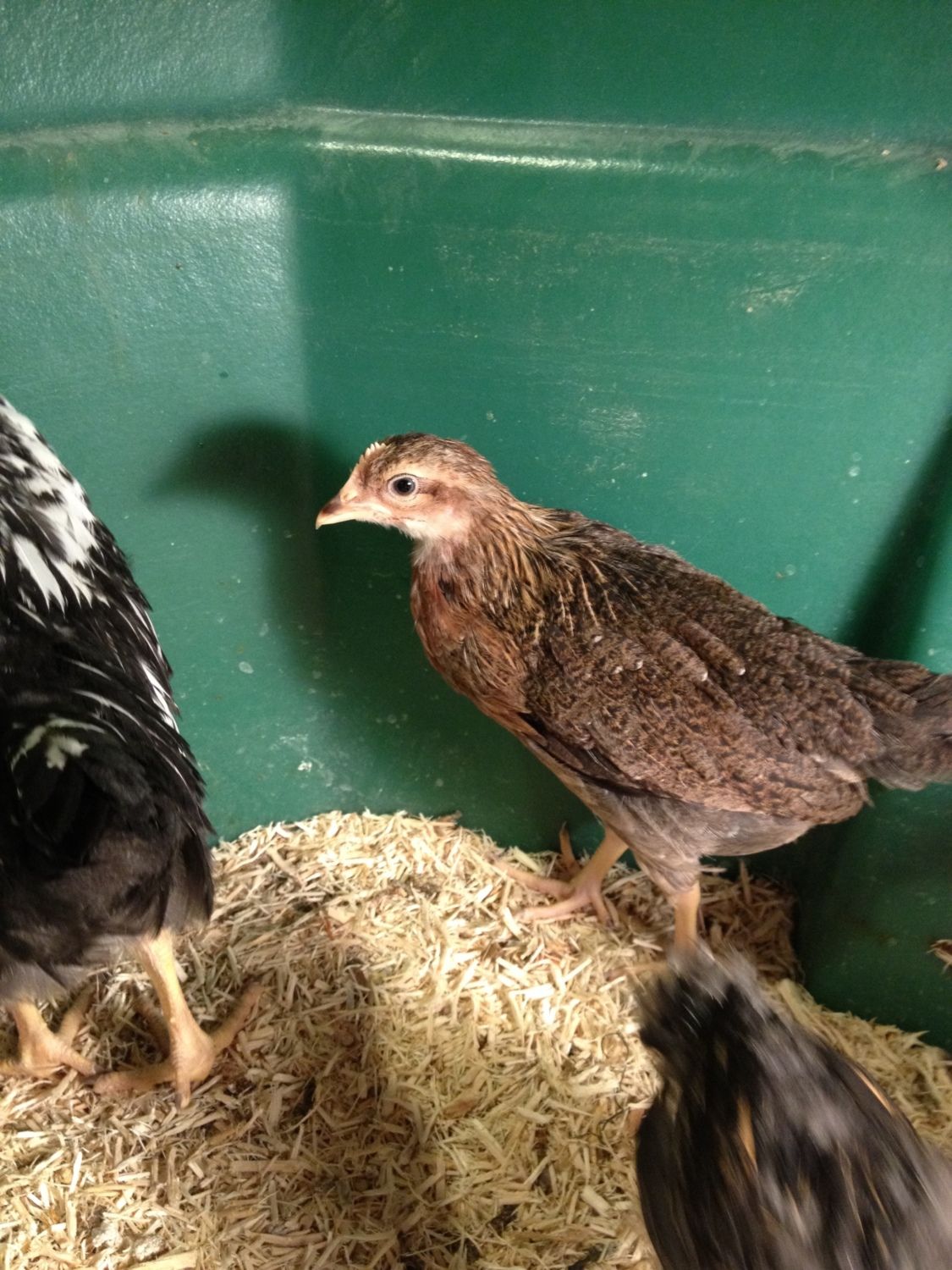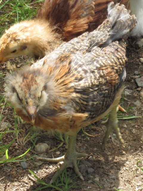 Last one is one of the GLW. Both of these chicks are really lagging behind the SLW. They are only one week younger, but they are tiny in comparison to Jerk! I started with 4 and 2 have died (no visible reason). This one started showing growth this week, and then suddenly last night it was jumping on all the other birds and taking on Tandoori, breast to breast. Its comb is shaped differently than all the other Wyandottes - very flat and wide. It's not very friendly either, but I haven't been making much effort to tame it since it looked like all 4 GLW might die.