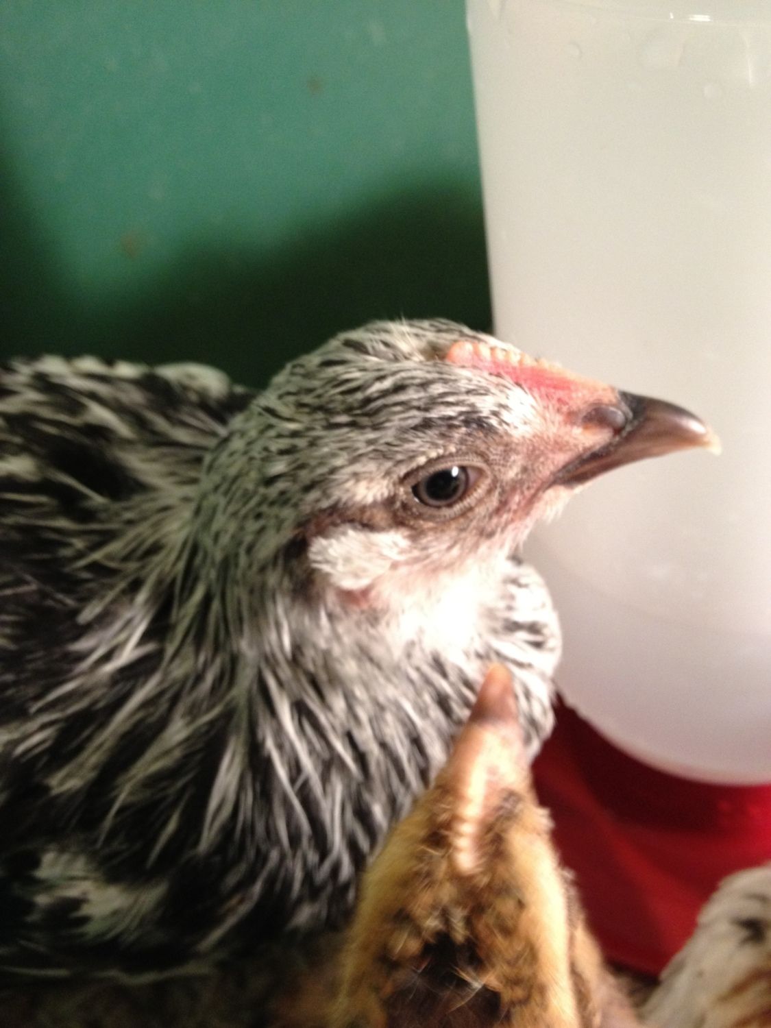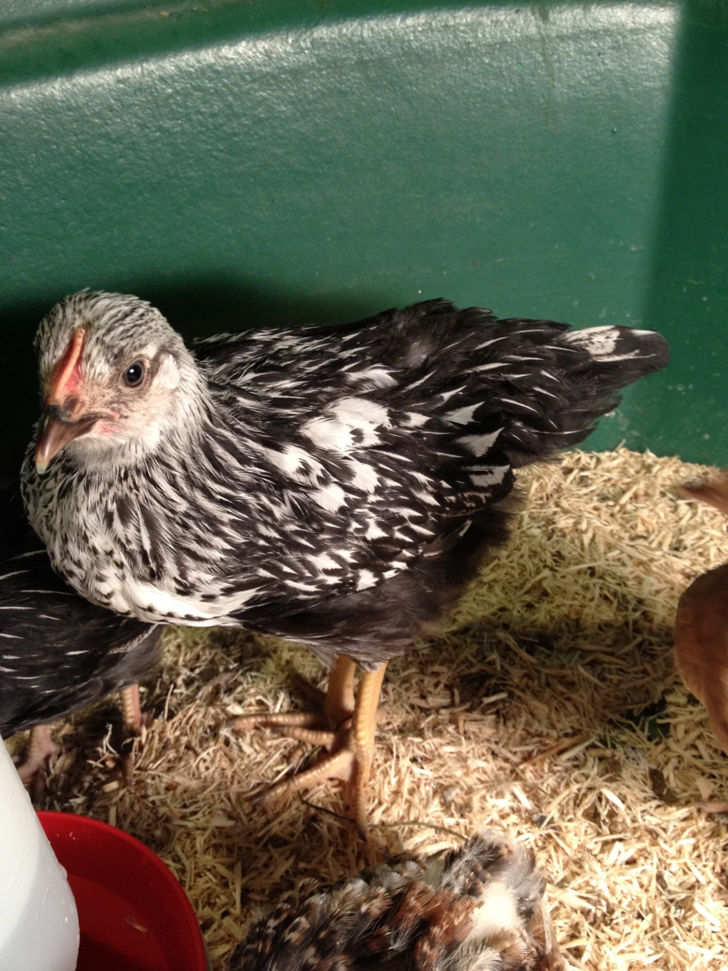 This is Jerk, a SLW that is growing like a weed. Dominant bird, but not very aggressive. The other SLW, Tandoori, is smaller but has and identical comb and is pushier than Jerk. Tandoori was forcing another chick to get down off the feeders last night by grabbing a toe or feathers.
