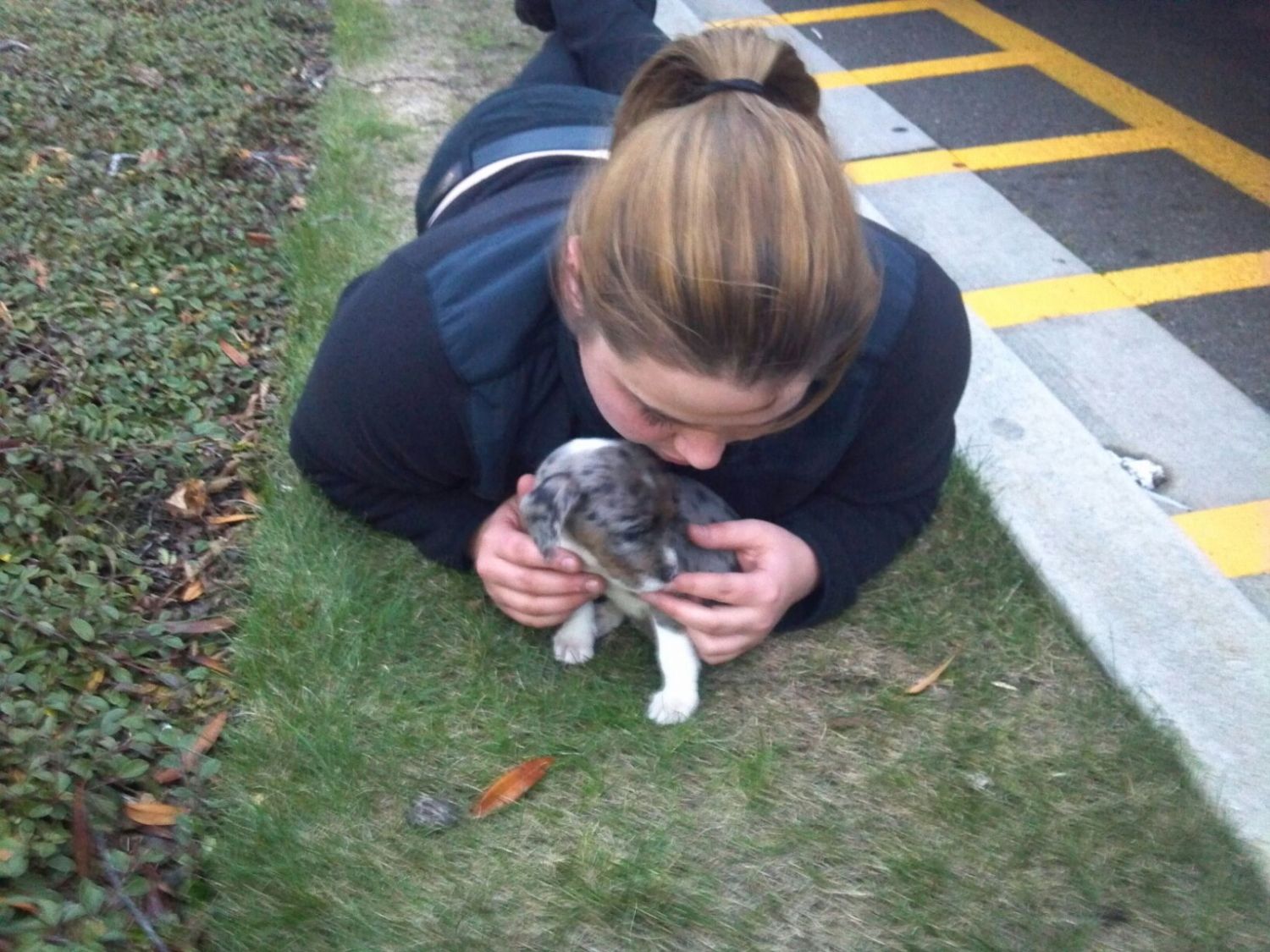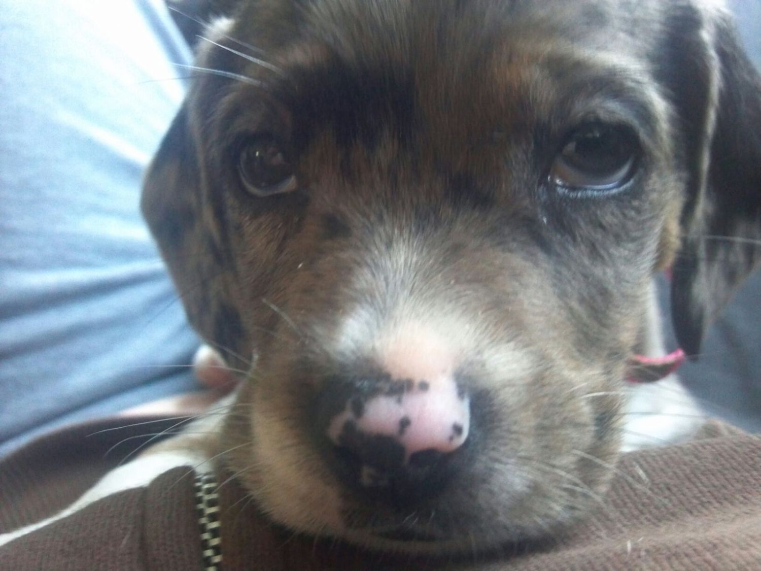 I think it is mostly Blue Tick Hound dog. The paws are the size of a large dog. It may not be as big as a hound due to mix.My husband and I are thinking about getting a dog. I've never been much of a dog person in the sense that I enjoy other people's well mannered dogs, but haven't really considered one for myself (mostly due to not wanting to give up my habit of going barefoot in the yard), but we've talked it over off n on for a while and thought if the right dog came along, we'd go for it. My sister sent me a text this morning, she rescued a 5 or 6 week old pup from a very neglectful living situation and was wondering if we (or someone we know) would want to take her in in a few months after they get her healthy, fixed, trained, and socialized...they just don't want to be the permanent home because they already have a couple of other BIG dogs.